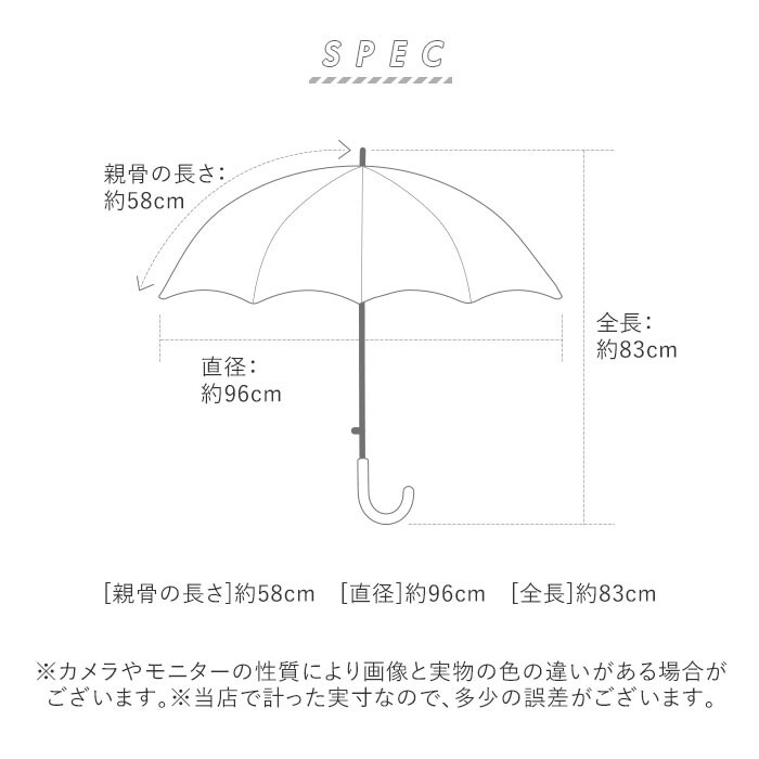 | サイズ | [親骨の長さ]約58cm/[直径]約96cm/[全長]約83cm ※サイズは当店計測の実寸サイズです。実際の商品ならびにメーカー表記サイズとは多少の誤差が生じる場合がございます。あらかじめご了承ください。 |