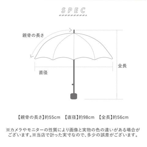 | サイズ | [親骨の長さ]約55cm/[直径]約98cm/[全長]約56cm [収納時の長さ]約25cm [収納時の幅]約6cm ※サイズは当店計測の実寸サイズです。実際の商品ならびにメーカー表記サイズとは多少の誤差が生じる場合がございます。あらかじめご了承ください。 |