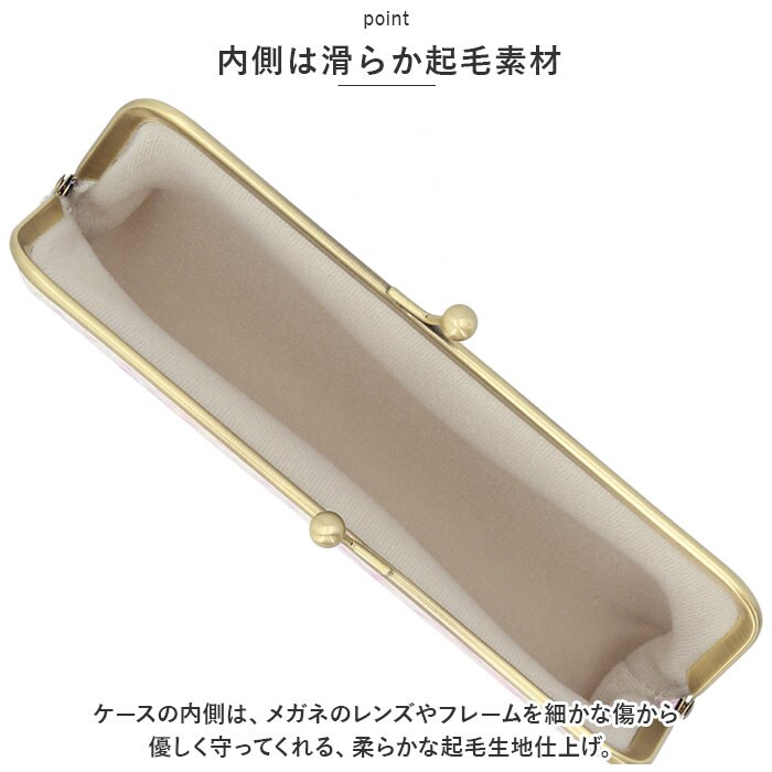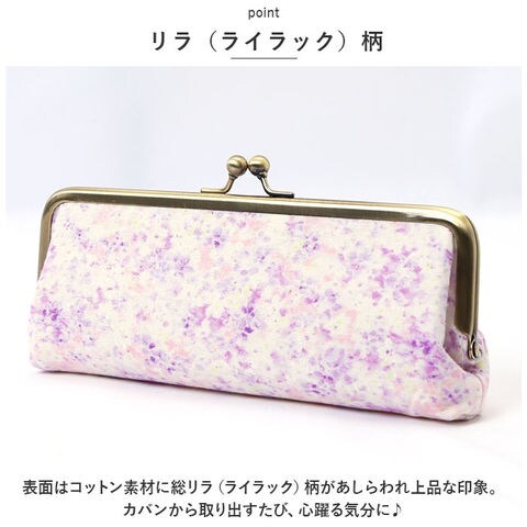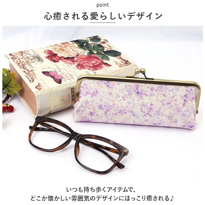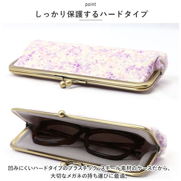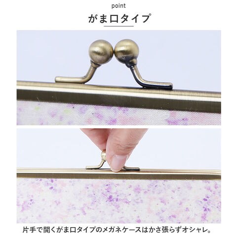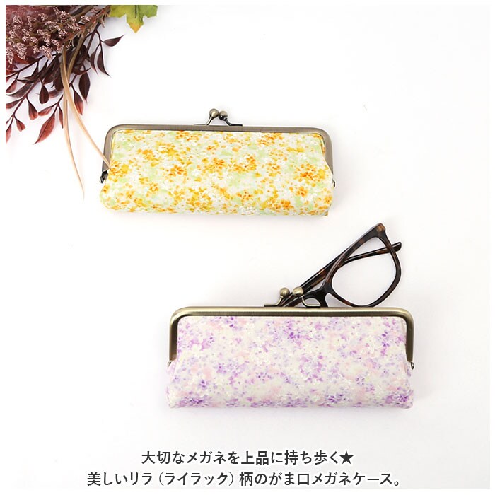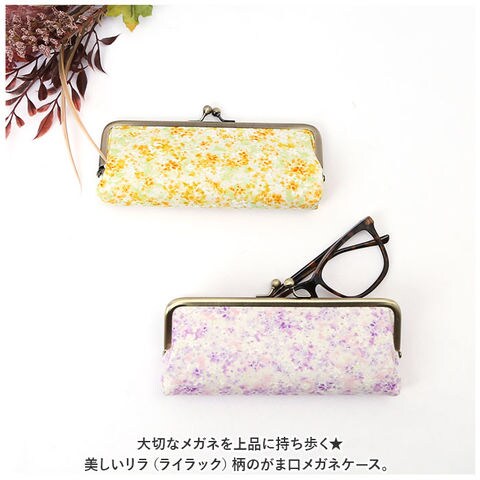| 商品説明 | 大切なメガネを上品に持ち歩く★美しいリラ(ライラック)柄のがま口メガネケース。【リラ(ライラック)柄】表面はコットン素材に総リラ(ライラック)柄があしらわれ上品な印象。カバンから取り出すたび、心躍る気分に♪【がま口タイプ】片手で開くがま口タイプのメガネケースはかさ張らずオシャレ。【しっかり保護するハードタイプ】凹みにくいハードタイプのプラスチック・スチール素材のケースだから、大切なメガネの持ち運びに最適。【内側は滑らか起毛素材】ケースの内側は、メガネのレンズやフレームを細かな傷から優しく守ってくれる、柔らかな起毛生地仕上げ。【心癒される愛らしいデザイン】いつも持ち歩くアイテムで、どこか懐かしい雰囲気のデザインにほっこり癒される♪ |