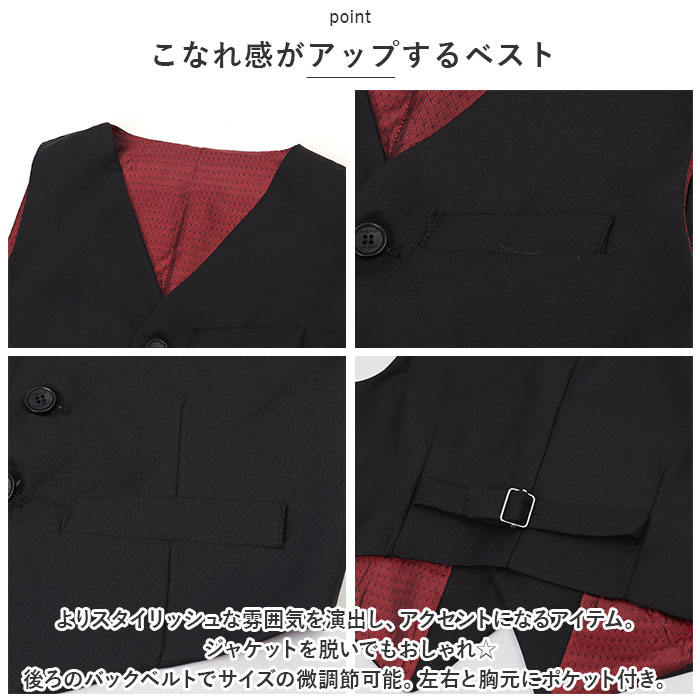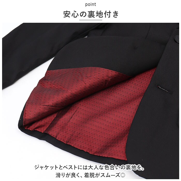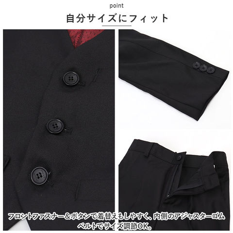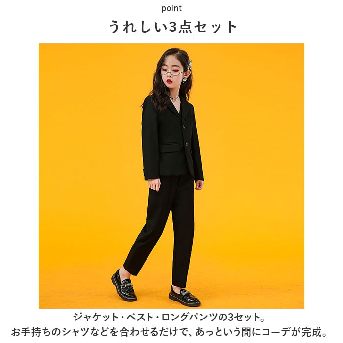 | 商品説明 | 色んなシーンで大活躍!スタイリッシュにキマる、女の子用パンツスーツ3点セット。【うれしい3点セット】ジャケット・ベスト・ロングパンツの3セット。お手持ちのシャツなどを合わせるだけで、あっという間にコーデが完成。【シンプルなブラックカラー】サラッとした生地感のブラックカラー。入学・卒業式、発表会などで、かっこよく大人顔負けの雰囲気を演出。【シングルジャケット】フロントボタンが1列に並んだ、スタンダードデザイン。ソフトな肩パッド入りで、美しいシルエットをキープ。左右と胸元にはポケットを配置。【こなれ感がアップするベスト】よりスタイリッシュな雰囲気を演出し、アクセントになるアイテム。ジャケットを脱いでもおしゃれ☆後ろのバックベルトでサイズの微調節可能。左右と胸元にポケット付き。【安心の裏地付き】ジャケットとベストには大人な色合いの裏地を。滑りが良く、着脱がスムーズ◎【スマートなロングパンツ】足元をすらっとキレイに魅せるフォルムに、こなれ感がアップするアンクル丈。左右にポケット付き。【自分サイズにフィット】フロントファスナー&ボタンで着替えもしやすく、内側のアジャスターゴムベルトでサイズ調節OK。【選べる6サイズ】成長に合わせて選べるサイズ展開。姉妹お揃いもできちゃう! |