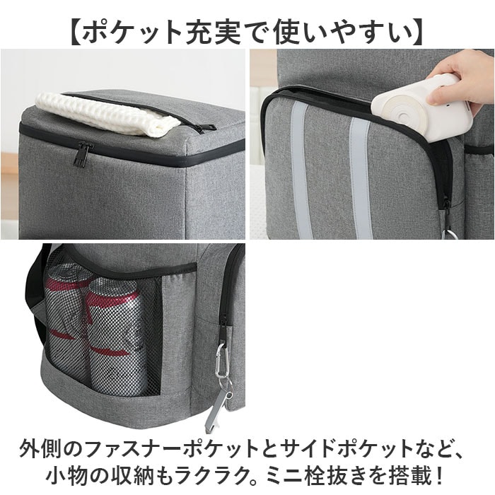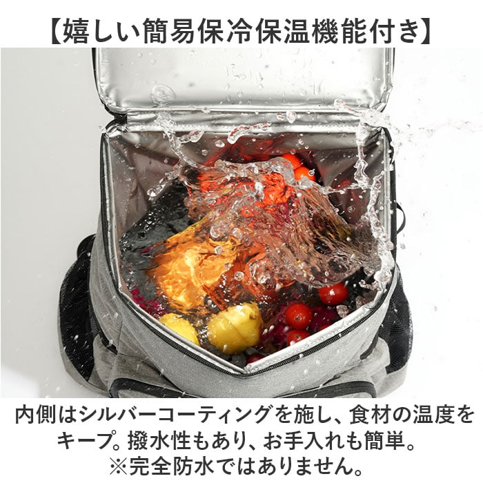 | 商品説明 | 【レジャーや買い出し、非常用にも!】たっぷり入って、温度をキープ!「保冷保温 リュック」が登場。【嬉しい簡易保冷保温機能付き】内側はシルバーコーティングを施し、食材の温度をキープ。撥水性もあり、お手入れも簡単。※完全防水ではありません。【ガバっと開くダブルファスナー】左右どちらからも、ぐるっとオープン!底までしっかり確認しやすく、整理整頓できる。【ざっくり収納ができる大容量サイズ】大きなペットボトルを立てて入れられるサイズ感。ザクザク収納できるスクエア型がGOOD。【ポケット充実で使いやすい】外側のファスナーポケットとサイドポケットなど、小物の収納もラクラク。ミニ栓抜きを搭載!【持ち歩きも快適に】背面と肩ストラップに、メッシュ素材とクッションをIN。長時間の持ち歩きの負担を軽減する。【お出かけも安心のリフレクターつき】暗くなった場所でも安全に使える、リフレクターデザイン。いざという時の防災用にもお役立ち【家族みんなで使えるシンプルさ】家族でシェアできる、ユニセックス仕様。保冷保温バッグに見えない、おしゃれなデザイン。【ポケット仕様】前面:ファスナーポケット×1サイド:メッシュオープンポケット×2蓋部分:ファスナーポケット×1 |