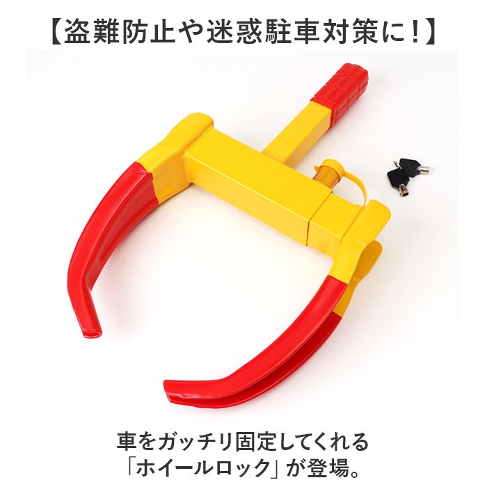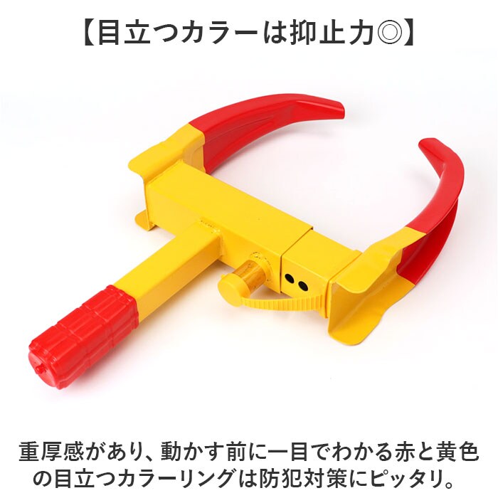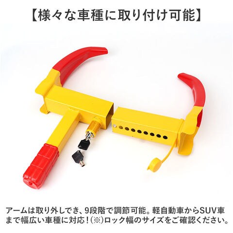 | 商品説明 | 【盗難防止や迷惑駐車対策に!】車をガッチリ固定してくれる「ホイールロック」が登場。【目立つカラーは抑止力◎】重厚感があり、動かす前に一目でわかる赤と黄色の目立つカラーリングは防犯対策にピッタリ。【キズが付きにくいラバー加工】アーム部分はソフトコーティング加工を施し、タイヤやリムに傷がつきにくく車にやさしい設計。【取り付けも簡単】ロックを解除してタイヤのサイズに合わせてアームを挟み込んだら調節穴に合わせてロックするだけ!【サビを防ぐ保護キャップ】ロック部分にはカギ穴を保護するキャップ付き。サビやイタズラを防いでくれて安心。【様々な車種に取り付け可能】アームは取り外しでき、9段階で調節可能。軽自動車からSUV車まで幅広い車種に対応!(※)ロック幅のサイズをご確認ください。 |
