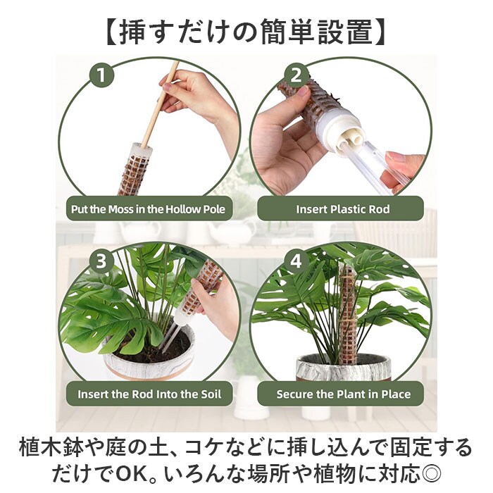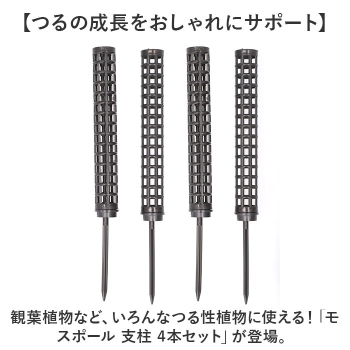 | 商品説明 | 【つるの成長をおしゃれにサポート】観葉植物など、いろんなつる性植物に使える!「モスポール 支柱 4本セット」が登場。【挿すだけの簡単設置】植木鉢や庭の土、コケなどに挿し込んで固定するだけでOK。いろんな場所や植物に対応◎【成長に合わせて長さ調節可能】支柱は、連結できる作りなので、成長や植物の大きさに合わせてサイズ調節が可能!【カビが発生しにくいプラ素材】挿入がしやすい&カビにくいプラスチック素材を採用。屋外も屋内も使える!【支柱に見えないおしゃれさ】お好みのカラーが選べる、シンプルデザイン。おしゃれな観葉植物にぴったりマッチ☆【いろんな植物に使える】モンステラ、ポトス、トマト、ミズゴケ、ツタなどの着生植物やつる性植物などに!【他ページにて2本セットを販売中】使いたい植物のサイズや、お庭の広さに合わせて必要な本数をゲットできる。 |