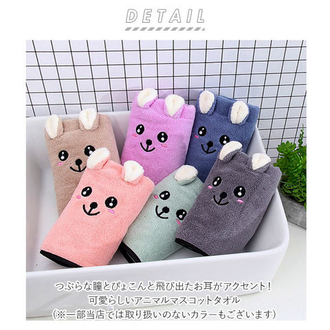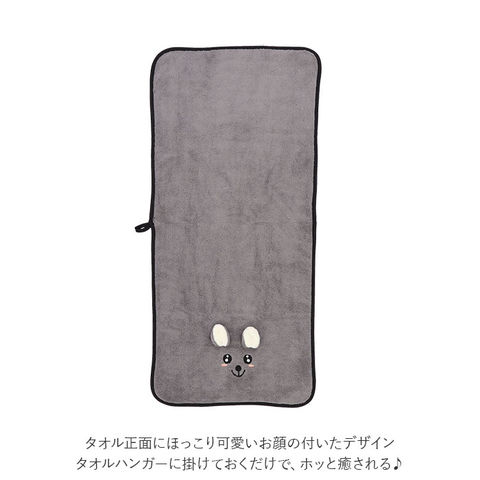 | 商品説明 | つぶらな瞳とぴょこんと飛び出たお耳がアクセント!可愛らしいアニマルマスコットタオル。タオル正面にほっこり可愛いお顔の付いたデザイン。タオルハンガーに掛けておくだけで、ホッと癒される♪ふわふわ生地のヒミツは「カットパイル」。通常はリング状になっているパイル毛をカットすることで、ふんわり優しい肌ざわりを実現。ポリエステル・ナイロン混紡のマイクロファイバー生地が水分をぐんぐん吸収。お風呂上がりのボディやヘアドライに最適。タオル地のフチにはパイピング加工を施し、お洗濯を繰り返しても型崩れにしくく、長く使えるのが嬉しいポイント。ウォールフックやS字フックに引っ掛けられるループ付き。ご家族のタオルを並べて掛けるととってもキュート。アニマルのお顔が見えるようにたたんでバスケットに収納すれば、サニタリールームが素敵に華やぐ。 |