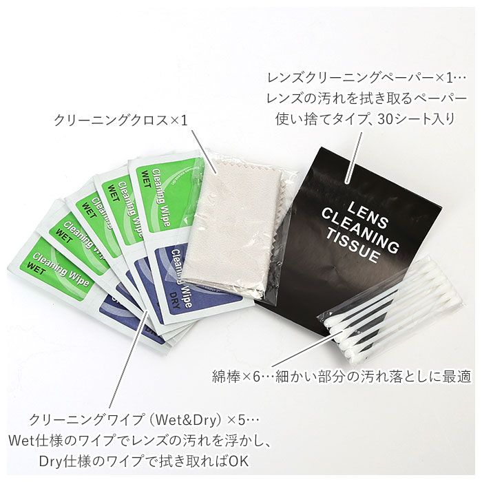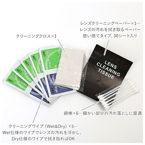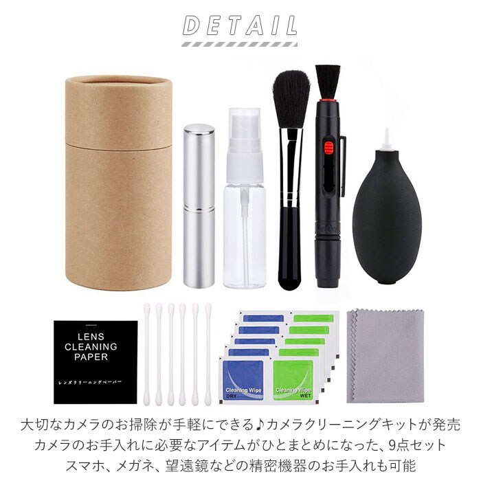 | 商品説明 | 大切なカメラのお掃除が手軽にできる♪カメラクリーニングキットが発売。カメラのお手入れに必要なアイテムがひとまとめになった、9点セット。スマホ、メガネ、望遠鏡などの精密機器のお手入れも可能。全てのアイテムを収納できる、筒状のボックス付き。・【セット内容】ダストブラシ×1…機器についたホコリをサッと落とすことができる。ブロアー×1…片手で持ちやすいサイズ感。弾力性が高く強力な風圧で、細かな隙間に入ったホコリを取り除くことが可能。クリーニングブラシ×1…スライド式&キャップ付き。リップと同じくらいのサイズ感で持ち運びに便利。レンズペン×1…クリーニング液不要でカンタンお掃除!ブラシとカーボン粉末タイプのW仕様で指紋や皮脂を残さず吸収、静電気を除去しホコリの付着を防止。スプレーボトル×1…お手持ちのクリーナー液を入れて、クロスやレンズクリーニングペーパーにシュッと一吹き!レンズクリーニングペーパー×1…レンズの汚れを拭き取るペーパー。使い捨てタイプ、30シート入り。綿棒×6…細かい部分の汚れ落としに最適。クリーニングワイプ(Wet&Dry)×5…Wet仕様のワイプでレンズの汚れを浮かし、Dry仕様のワイプで拭き取ればOK。クリーニングクロス×1…マイクロファイバー素材で指紋や皮脂、ほこりをしっかりキャッチ。手洗いして繰り返し使える◎ |