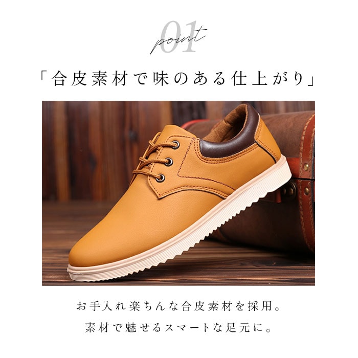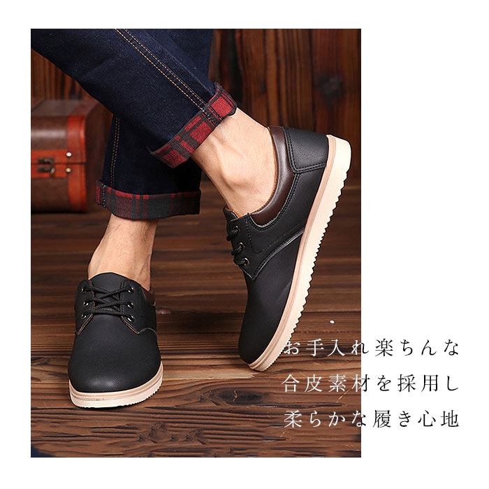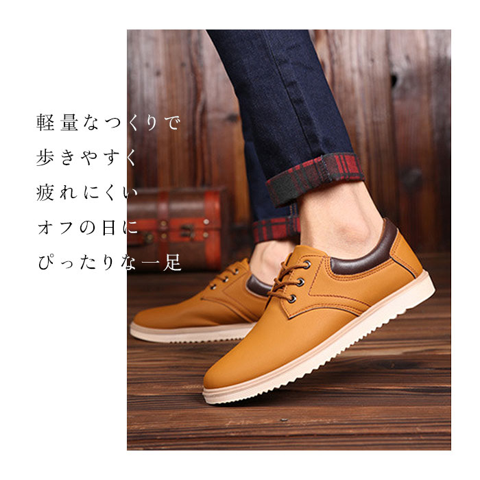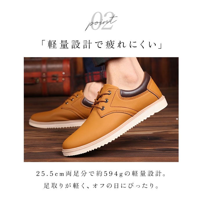 | 商品説明 | ビジネスからカジュアルまでOK!幅広いシーンで活躍するシューズが登場!【柔らか素材】足に馴染む柔らかな合皮素材を使用。屈曲性があり軽量なので、疲れにくく履き心地にもこだわったアイテム。【滑りにくい】アウトソールは滑りにくく、雨の日でも滑りにくいように配慮。【インソール取り外し可能】インソール部分は取り外し可能。お手入れしやすく清潔に保てるのも嬉しいポイント。【シンプルデザイン】すっきりとしたシルエット。シンプルなレースアップシューズなので、幅広いコーディネートに対応。 |
