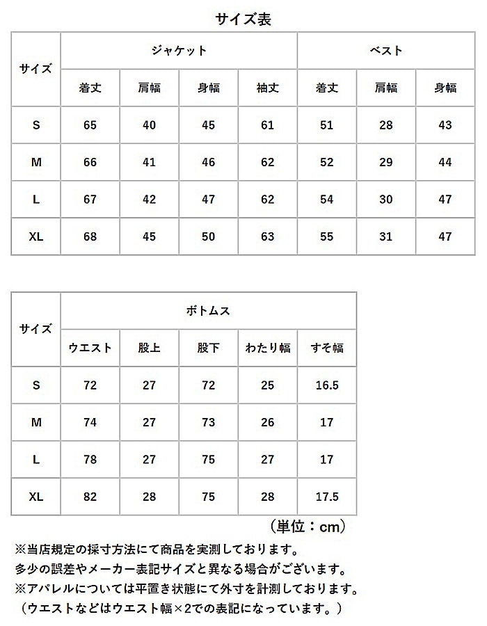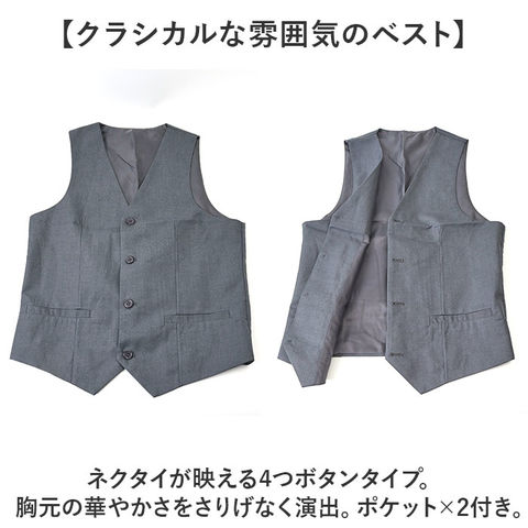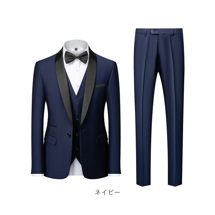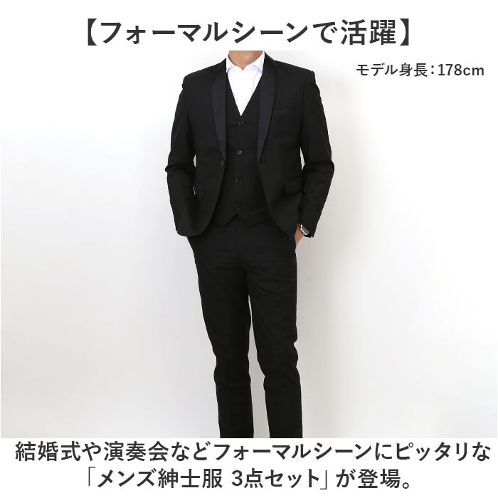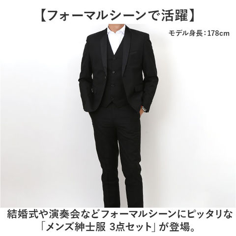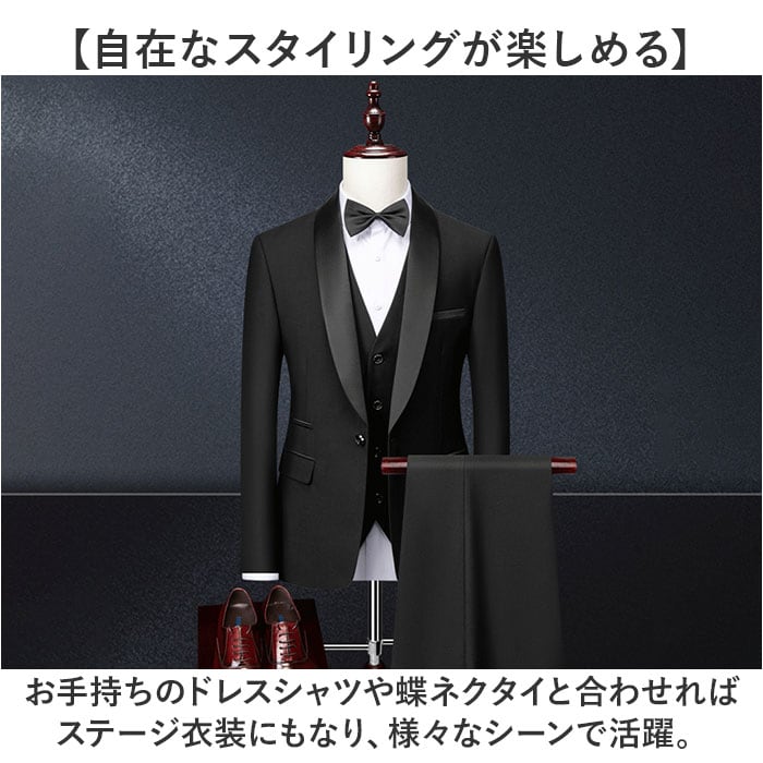 | 商品説明 | 【フォーマルシーンで活躍】 結婚式や演奏会などフォーマルシーンにピッタリな「メンズ紳士服 3点セット」が登場。【うれしい3点セット】ジャケット、ベスト、パンツの3点セット。体に程よくフィットしてシルエットもきれい。【上品なスタイルのジャケット】襟やポケットの一部にはサテン調生地を使用。さりげないアクセントを加え上品さをプラス。【ベーシックなシングルタイプ】フロントボタンを1つ配置し、スマートな印象を演出。内側やフロントにポケットを複数配置。【クラシカルな雰囲気のベスト】ネクタイが映える4つボタンタイプ。胸元の華やかさをさりげなく演出。ポケット×2付き。【フィット感の調節可能】背中の尾錠付きベルトで、ウエストのフィット感の微調整が可能。【シンプルなストレートパンツ】スッキリとしたシルエットのノータックパンツ。前後にポケット付きでスマホなどが入れられる。【自在なスタイリングが楽しめる】お手持ちのドレスシャツや蝶ネクタイと合わせればステージ衣装にもなり、様々なシーンで活躍。 |