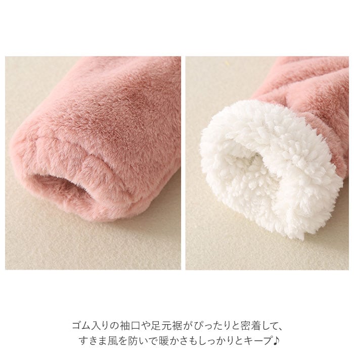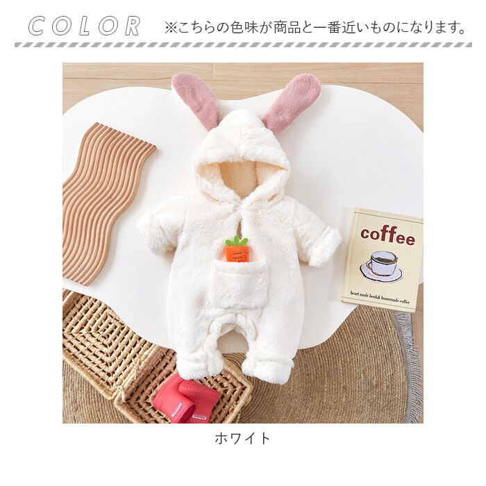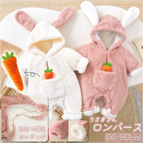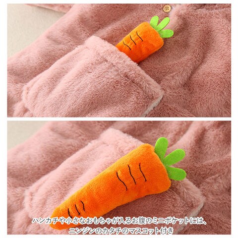 | 商品説明 | 着ぐるみみたいに可愛いふわモコのうさぎさんに変身!ベビー用「うさぎさん・ロンパース」!表生地は本物の毛皮みたいにふわふわな手触りのフェイクファー。内側はモコモコのボア素材で仕上げて、肌寒い季節もほっこりあったか♪フードにぴょこんと付いた、ぽってり厚みのある「ウサ耳」がチャームポイント。ロンパース足元部分からベビーの頭にすっぽりと被せ、胸元のゴムフック付きボタンを外せば、脱ぎ着が楽ちん。ゴム入りの袖口や足元裾がぴったりと密着して、すきま風を防いで暖かさもしっかりとキープ♪両足内側からクロッチ部分まではスナップボタンで簡単にオープンするので、おむつ替えが手早くできるのも嬉しいポイント。ハンカチや小さなおもちゃが入るお腹のミニポケットには、ニンジンのカタチのマスコット付き。秋冬時期のパジャマやルームウェアとしてはもちろん、ご家族の記念撮影にも大活躍! |