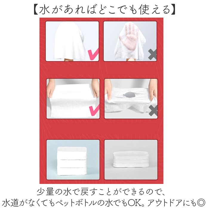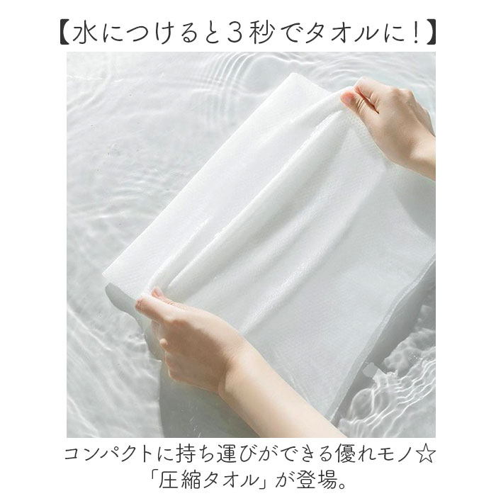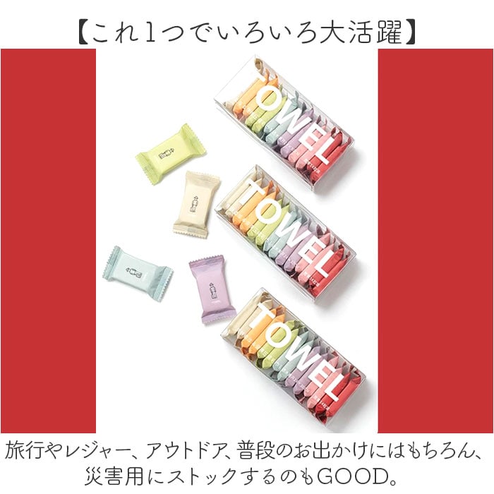| 商品説明 | 【水につけると3秒でタオルに!】コンパクトに持ち運びができる優れモノ☆「圧縮タオル」が登場。【持ち運びに便利なコンパクトさ】お菓子のようなキュートな見た目♪旅行や外出先へ、コンパクトに持ち運べる便利グッズ。【水に濡らせば3秒でタオルに】水に濡らすとみるみるうちに膨らみ、ハンドタオルほどの大きさに☆すぐに使えるのがポイント。【清潔感のあるホワイト仕様】どんな用途にもマッチする、シンプルなホワイト仕様のタオル。シーンを選ばないのが嬉しい。【水があればどこでも使える】少量の水で戻すことができるので、水道がなくてもペットボトルの水でもOK。アウトドアにも◎【これ1つでいろいろ大活躍】旅行やレジャー、アウトドア、普段のお出かけにはもちろん、災害用にストックするのもGOOD。 |