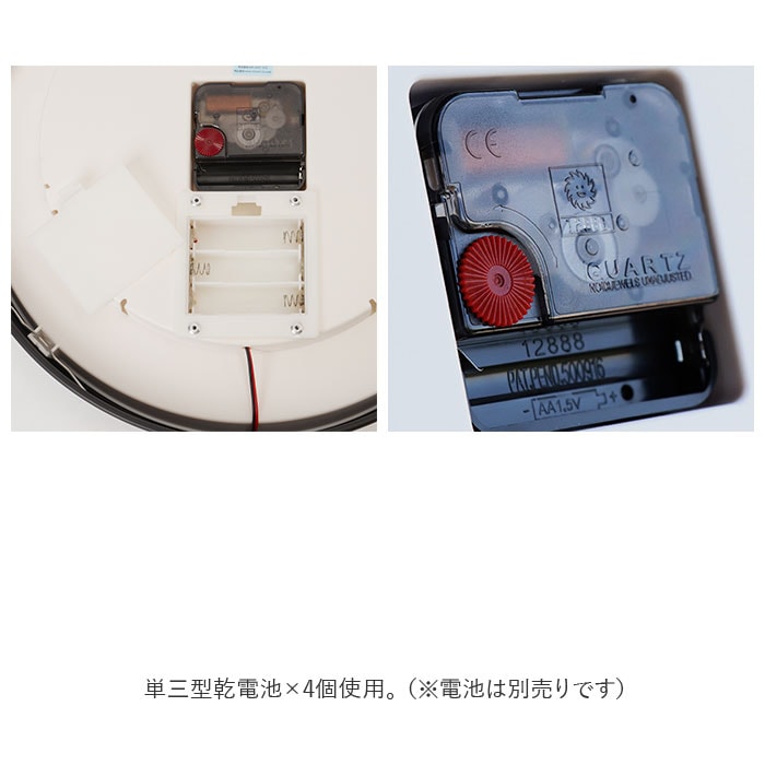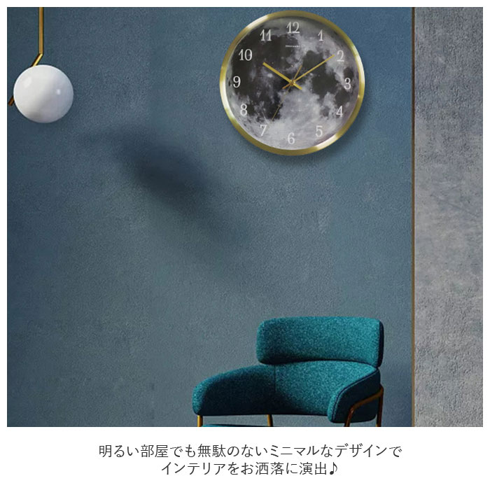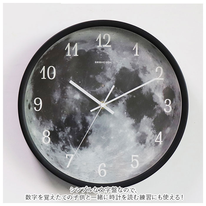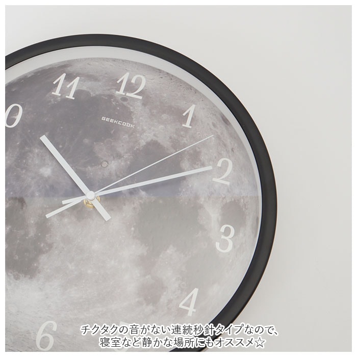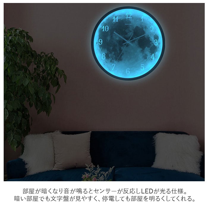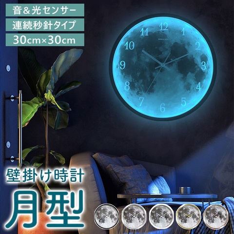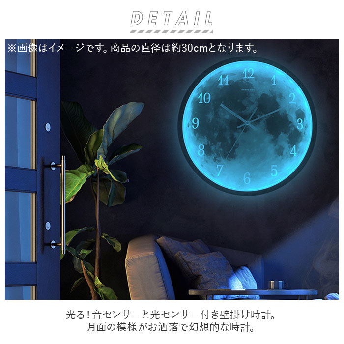 商品説明光る!音センサーと光センサー付き壁掛け時計。月面の模様がお洒落で幻想的な時計。部屋が暗くなり音が鳴るとセンサーが反応しLEDが光る仕様。暗い部屋でも文字盤が見やすく、停電しても部屋を明るくしてくれる。明るい部屋でも無駄のないミニマルなデザインでインテリアをお洒落にデザイン演出♪チクタクの音がない連続秒針タイプなので、寝室など静かな場所にもオススメ☆シンプルな文字盤なので、数字を覚えたての子供と一緒に時計を読む練習にも使える!前面ガラスで 汚れをサッと拭き取れてお掃除簡単☆様々なシーンにスッと馴染むので、ご自宅以外にも新築祝いなどプレゼントにもオススメ。単三型乾電池×4個使用。(※電池は別売りです)