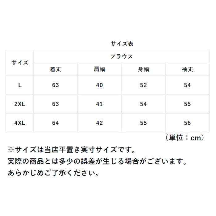 | サイズ | [レディース] ・Lサイズ ・2XLサイズ ・4XLサイズ ※サイズについて詳細は、商品画像の中にあるサイズ表をご覧くださいませ。 |
