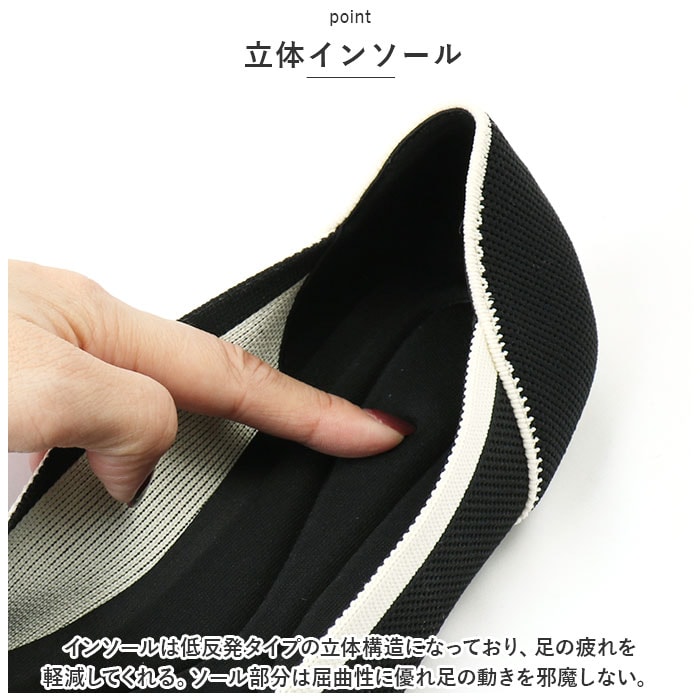 | 商品説明 | 柔らかさと軽さが嬉しいニットパンプスが新登場。【ポインテッドトゥ】ヒールなしのぺたんこタイプなのに、シャープなオトナっぽい印象のパンプス。脚をキレイに魅せてくれる、ポインテッドトゥが魅力♪【らくちんな履き心地】伸びの良いニット素材を採用。脚にフィットするので履き心地も良く、通気性にも優れ靴内を快適に◎【立体インソール】インソールは低反発タイプの立体構造になっており、足の疲れを軽減してくれる。ソール部分は屈曲性に優れ足の動きを邪魔しない。【靴底はラバー素材】アウトソールにはグリップ力があるラバー素材を使用。濡れた路面やタイル貼りの床でも滑りにくく安定感のある歩行に。【折りたたみOK】コンパクトにクルッと折りたたんで持ち運びOK!旅先でも活躍。【選べるカラー】カラーバリエーションが豊富。シンプルデザインなので、色物にもチャレンジしやすい♪お好みのカラーをチョイス。 |