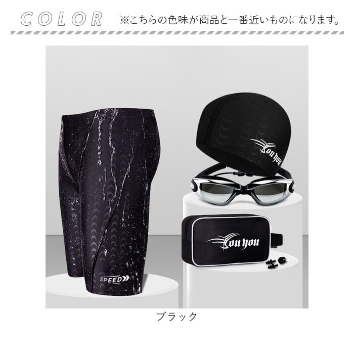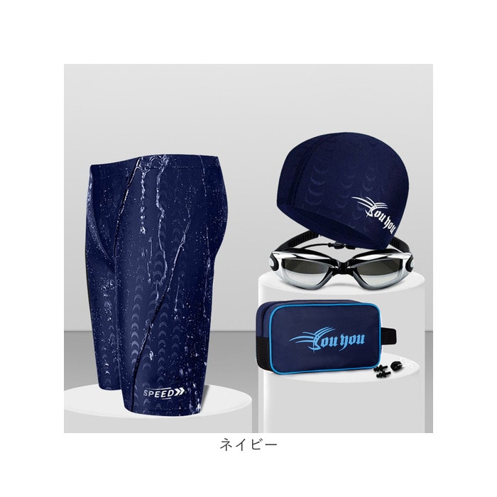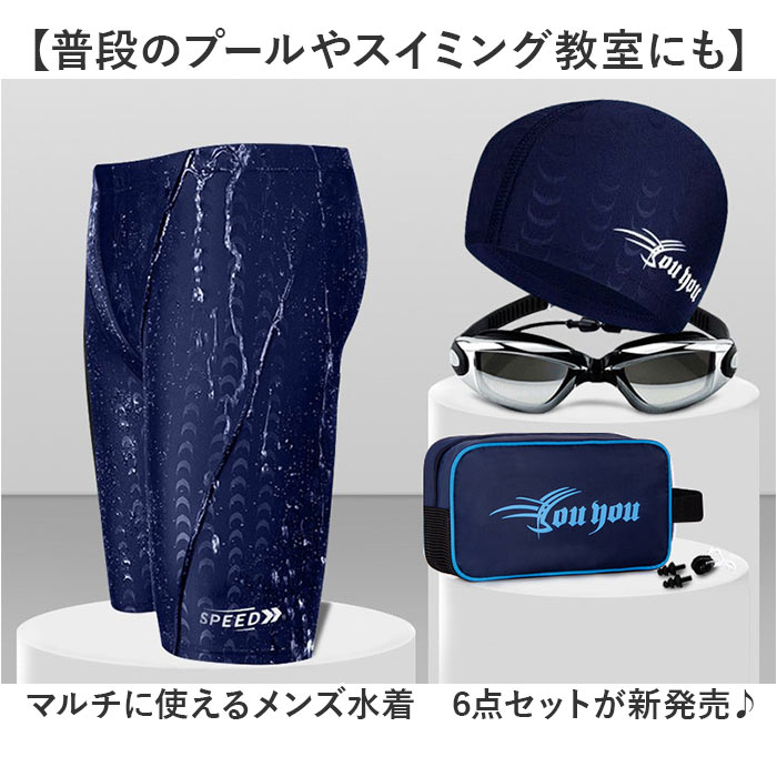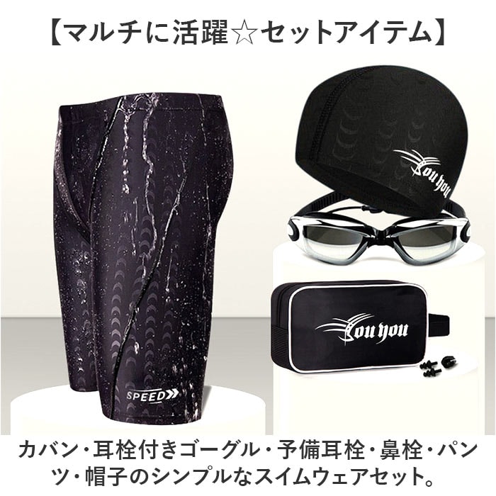 | 商品説明 | 【普段のプールやスイミング教室にも】マルチに使えるメンズ水着 6点セットが新発売♪【マルチに活躍☆セットアイテム】カバン・耳栓付きゴーグル・予備耳栓・鼻栓・パンツ・帽子のシンプルなスイムウェアセット。【教室や競泳用にも】シンプルなデザインなので、普段使いはもちろん、教室や競泳用にもピッタリ。【2重構造でそのまま穿ける】パンツの股部分は2重構造になっておりショーツなしでそのまま着用OK。【まぶしくなりにくいミラー加工】ゴーグルは室内のライトや太陽光のまぶしさを軽減するミラー加工済み。【耳栓と一体】耳栓とゴーグルは一体型になっており、泳いだりプールサイドに上がるときも紛失しない。【水の侵入をより防ぐ帽子】帽子は耳までしっかりカバーする作りで水の侵入をより防ぐ!【収納に便利なカバン付き】底がメッシュになっており通気性アリ!濡れたスイムウェアを入れても。 |