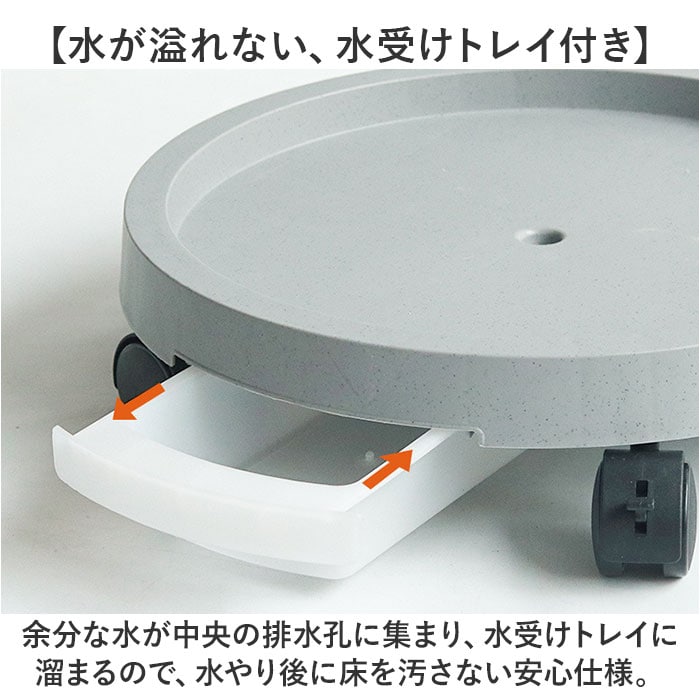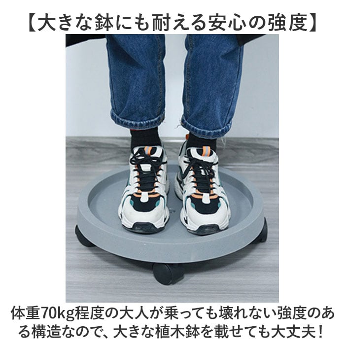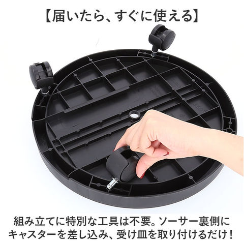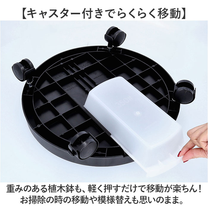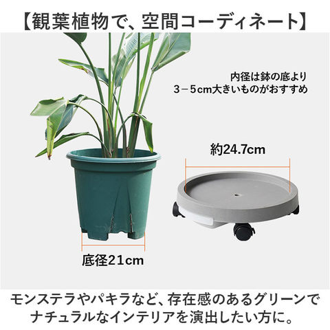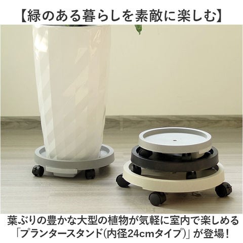 | 商品説明 | 【緑のある暮らしを素敵に楽しむ】葉ぶりの豊かな大型の植物が気軽に室内で楽しめる「プランタースタンド(内径24cmタイプ)」が登場!【キャスター付きでらくらく移動】重みのある植木鉢も、軽く押すだけで移動が楽ちん!お掃除の時の移動や模様替えも思いのまま。【水が溢れない、水受けトレイ付き】余分な水が中央の排水孔に集まり、水受けトレイに溜まるので、水やり後に床を汚さない安心仕様。【ロック付きキャスターで安全】・360度回転するキャスターはワンタッチで固定できるロックレバー搭載。滑りやすい床でも安心。【大きな鉢にも耐える安心の強度】体重70kg程度の大人が乗っても壊れない強度のある構造なので、大きな植木鉢を載せても大丈夫!【サッと洗えて、お手入れ楽ちん】汚れが気になったらサッと洗える。ソーサーも水受けトレイもお手入れの楽なポリプロピレン素材。【届いたら、すぐに使える】組み立てに特別な工具は不要。ソーサー裏側にキャスターを差し込み、受け皿を取り付けるだけ!【使い方はアイディア次第♪】頻繁に位置を移動する扇風機やスタンド型ヒーターのスタンドや、重い物の運搬にも大活躍。【観葉植物で、空間コーディネート】モンステラやパキラなど、存在感のあるグリーンでナチュラルなインテリアを演出したい方に。 |