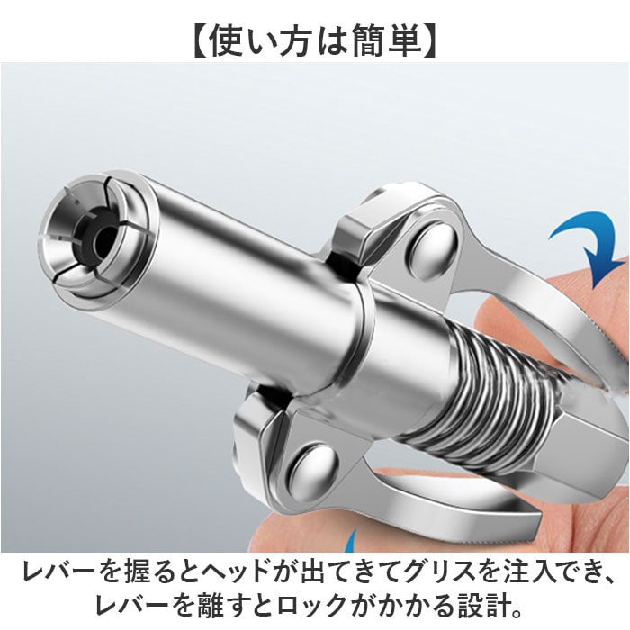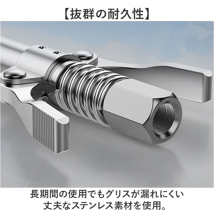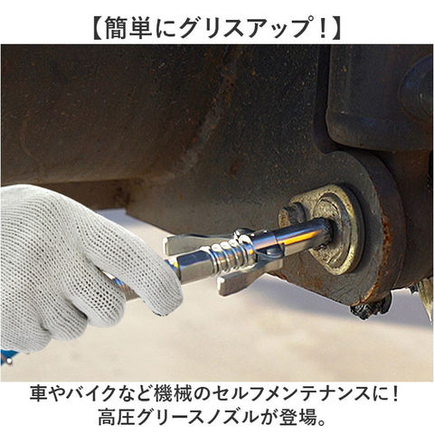 | 商品説明 | 【簡単にグリスアップ!】車やバイクなど機械のセルフメンテナンスに!高圧グリースノズルが登場。【可動部分の動きをなめらかに】摩擦を抑え、滑りを良くすることで大事な機械の寿命を延ばしてくれるアイテム。【使い方は簡単】レバーを握るとヘッドが出てきてグリスを注入でき、レバーを離すとロックがかかる設計。【抜群の耐久性】長期間の使用でもグリスが漏れにくい丈夫なステンレス素材を使用。【様々なツールに使用可能】ミニグリースツールを含む標準的なグリースツールに適合。(※サイズをご確認ください。)【使い勝手の良いコンパクトサイズ】約40cmのホースが付属。グリスを注入しにくいところや、狭いスペースでも使用可能! |