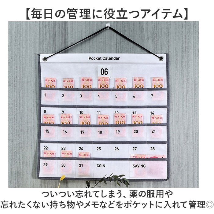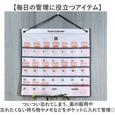 商品説明【薬の飲み忘れなどを防止!】1年中使える、マンスリーカードつき!「カレンダー ウォールポケット」が登場。【毎日の管理に役立つアイテム】ついつい忘れてしまう、薬の服用や忘れたくない持ち物やメモなどをポケットに入れて管理◎【日にちとマンスリーカードつき】専用のマンスリーカードつきなので、365日毎日使える!万年カレンダーとして予定の管理も!【ちょうど良いポケットのサイズ】小物の収納にちょうどいい、スッと手が入るサイズ感。ポイントカードや印鑑なども入る。【シンプルだからリビングにも♪】かける場所を問わない、シンプルでおしゃれなデザイン。毎日目に入るリビングにつけるのも◎【日にちが隠れないから安心】ポケットに日にちを印字し、ポケットに物をいれても、日にちが見えにくくならないよう配慮。【いろんなシーンで使える】ご家庭はもちろん、オフィスや病院、お子さまの忘れ物対策などにも大活躍!