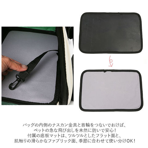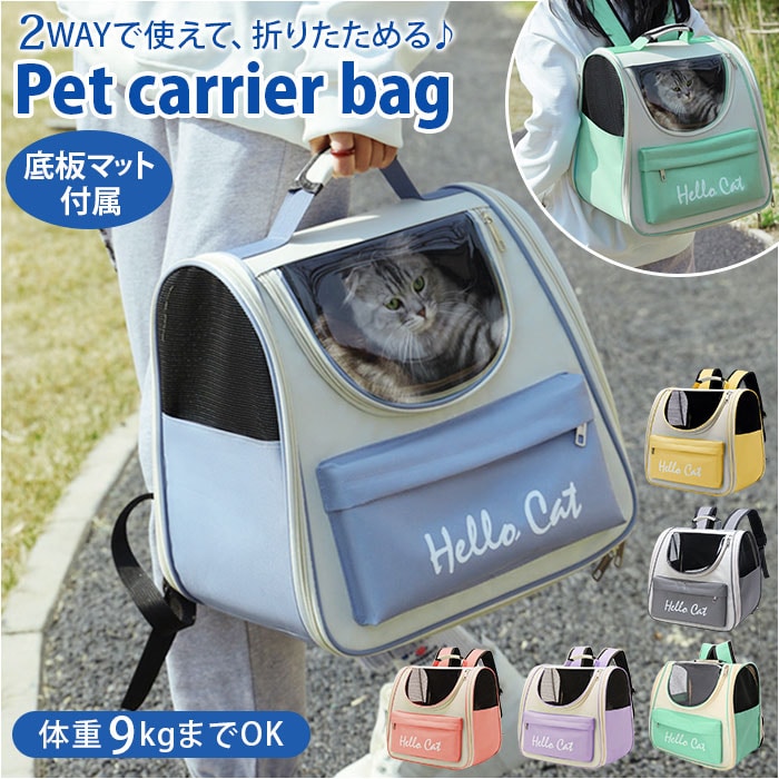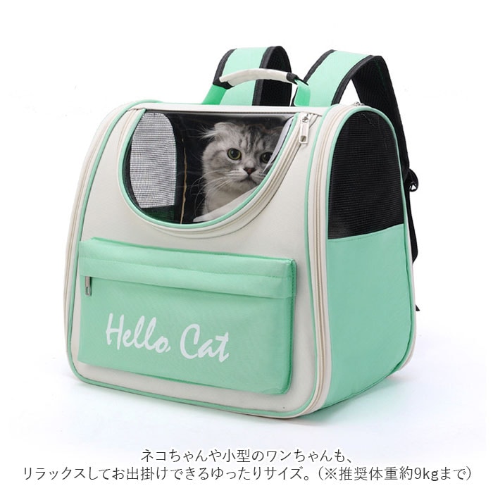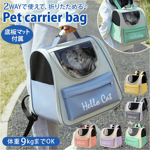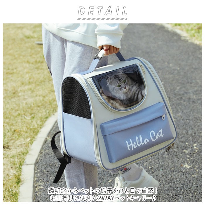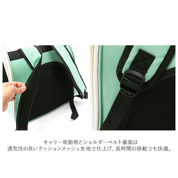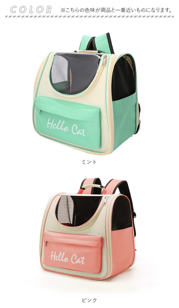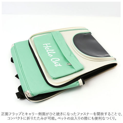 | 商品説明 | 透明窓からペットの様子をひと目で確認!お出掛けに便利な2WAYペットキャリー♪両サイドに通気性抜群のメッシュ窓、正面にはクリア素材できた半円型透明窓を設けた可愛らしいデザイン。中のペットも外を眺めることができ、窮屈さを感じさせない安心仕様。正面の透明窓はファスナーで開くことができるので、外出先で落ち着かないペットの頭を撫でたり、身体の小さなネコちゃんなら抱き上げるようにして出入りが可能。バッグの内側のナスカン金具と首輪をつないでおけば、ペットの急な飛び出しを未然に防いで安心!底板マットが付属しているため、ペットが安定した姿勢でくつろげるのも嬉しいポイント。ツルツルとしたフラット面と、肌触りの滑らかなファブリック面、季節に合わせて使い分けOK!キャリーの両側面に、ペットシーツやウェットティッシュなどのケア用品を持ち歩けるオープンポケット×2を配置。・「Hello Cat」のロゴが目を惹く!フロントのファスナーポケットはペットのおやつやフード、飼い主さんのスマホなど小物収納に便利!手持ちのペットバッグとしてはもちろん、長さ調節のできるショルダーベルトで肩掛けにもできる2WAY仕様。キャリー背面側とショルダーベルト裏面は通気性の良いクッションメッシュ生地で仕上げ、長時間の移動でも快適。正面フラップとキャリー側面がひと続きになったファスナーを開放することで、コンパクトに折りたたみが可能。ペットの出入りの際にも便利なつくり。ネコちゃんや小型のワンちゃんも、リラックスしてお出掛けできるゆったりサイズ。(※推奨体重約9kgまで)オシャレなパステルカラーのバリエーションで、動物病院への通院やペットと一緒の旅行・お出掛けに最適。 |