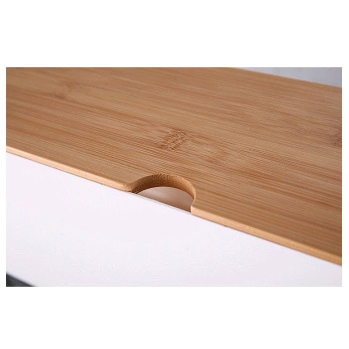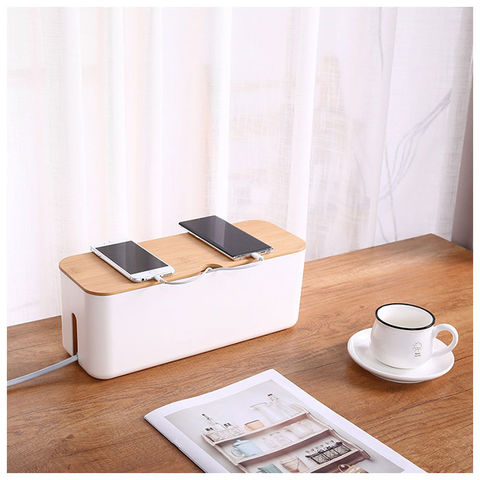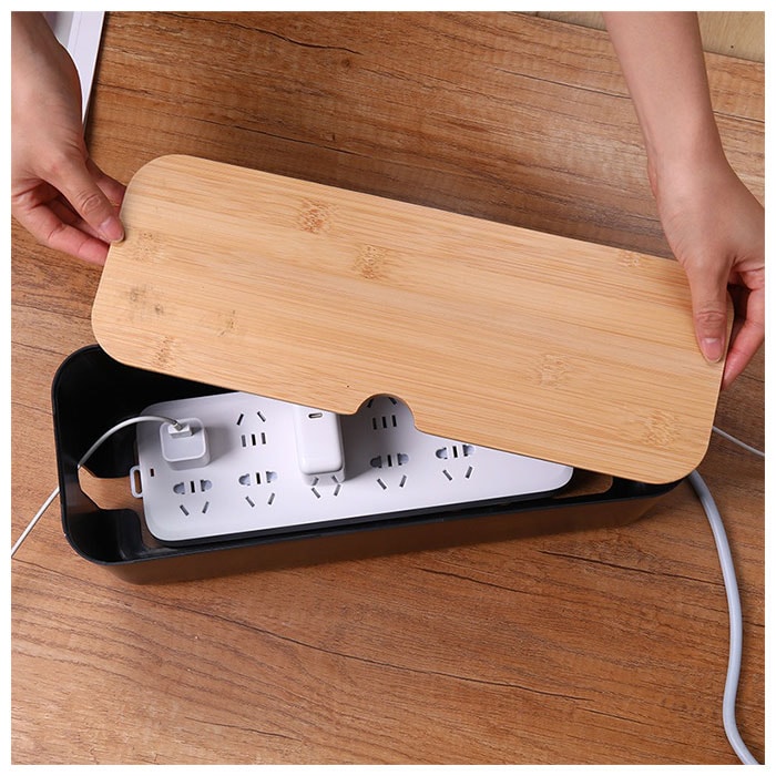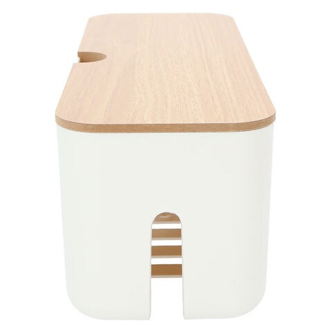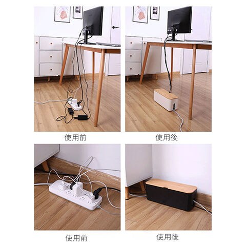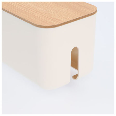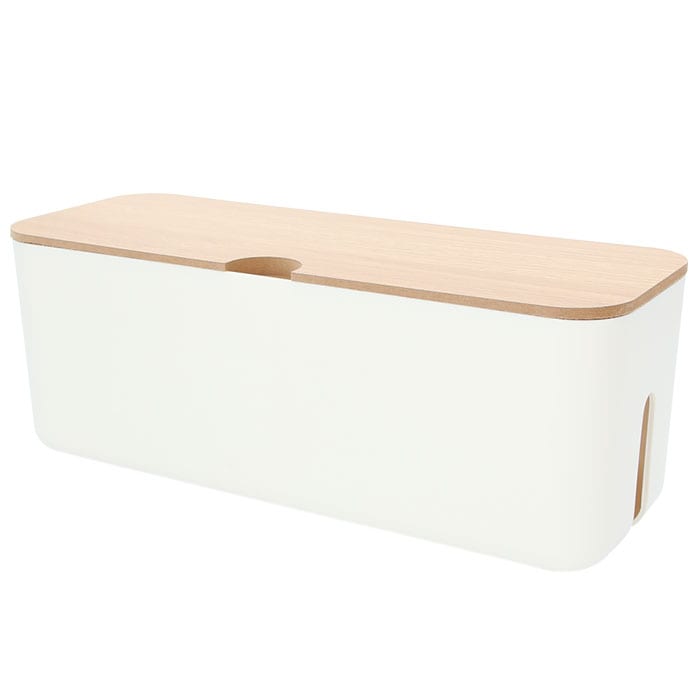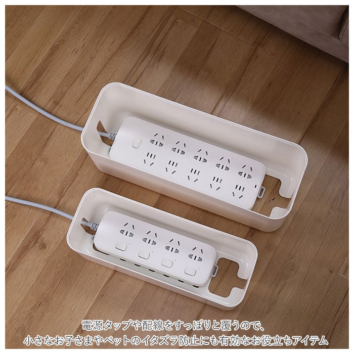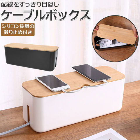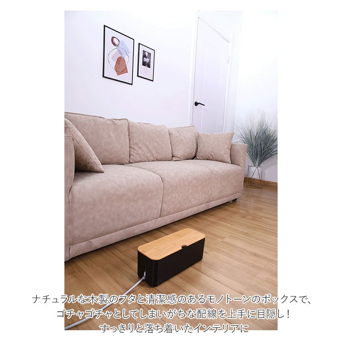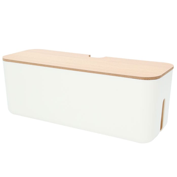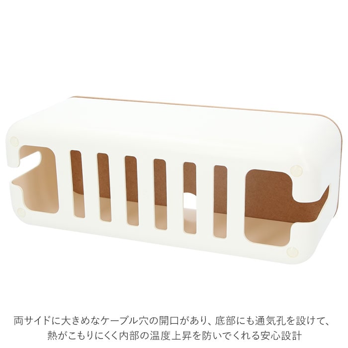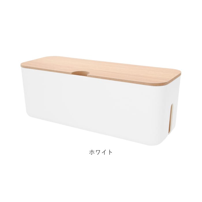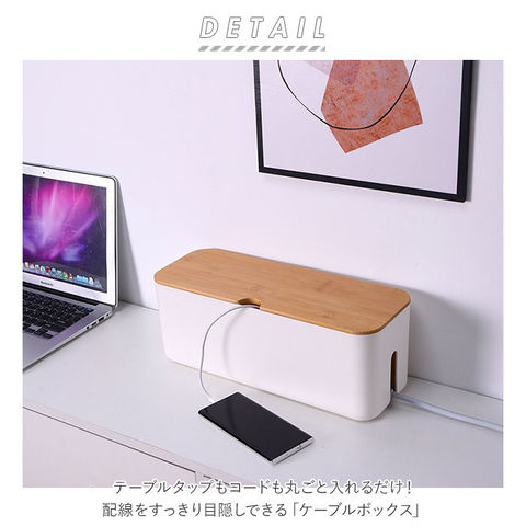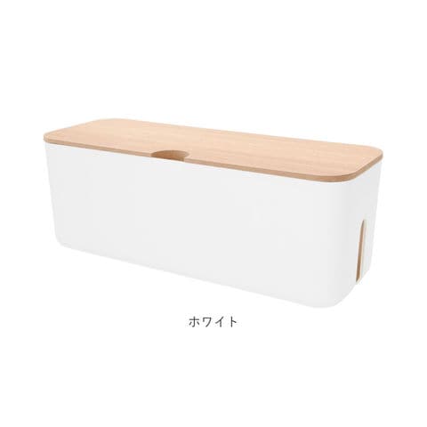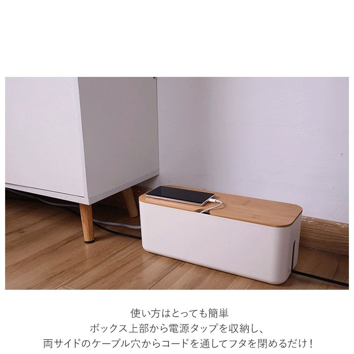 | 商品説明 | テーブルタップもコードも丸ごと入れるだけ!配線をすっきり目隠しできる「ケーブルボックス」。ナチュラルな木製のフタと清潔感のあるモノトーンのボックスで、ゴチャゴチャとしてしまいがちな配線を上手に目隠し!すっきりと落ち着いたインテリアに。使い方はとっても簡単。ボックス上部から電源タップを収納し、両サイドのケーブル穴からコードを通してフタを閉めるだけ!(※長さ約26cm、横幅約8cm程度のテーブルタップが収納できるサイズです。)両サイドに大きめなケーブル穴の開口があり、底部にも通気孔を設けて、熱がこもりにくく内部の温度上昇を防いでくれる安心設計。電源タップとコンセントの間にたまりやすいホコリを防いで、お掃除の手間がなくラクチン。さらに、漏電による火災の予防にもなり、とっても安全。電源タップや配線をすっぽりと覆うので、小さなお子さまやペットのイタズラ防止にも有効なお役立ちアイテム。つるつるとした床やデスクの上でもボックスがズレにくい、底面にはシリコン樹脂の滑り止め付き。デスクやフローリングに設置してもお部屋の雰囲気を損なわない、シンプルなデザインが魅力。 |