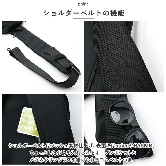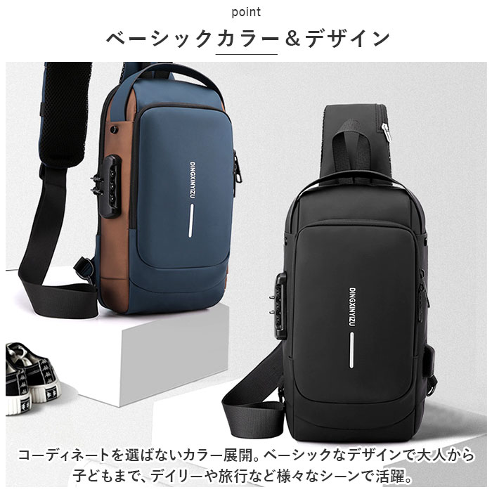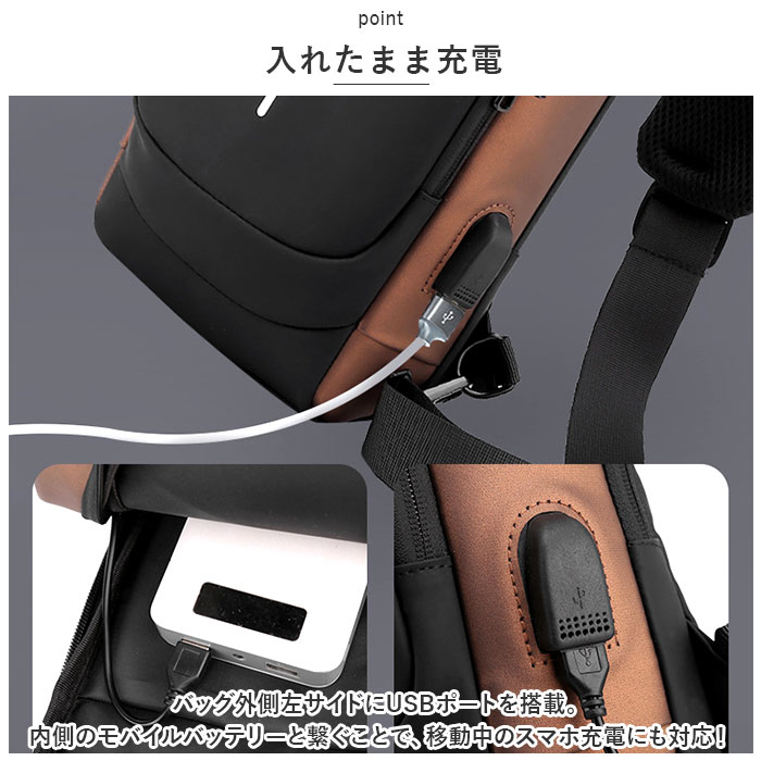 | 商品説明 | ロック機能付きで盗難防止に。スタイリッシュなボディバッグの登場♪【盗難防止】外出先や旅先での盗難から守る、3ケタの安全パスワードロック機能付。【ダブルファスナー式】メインルームは開口部は大きく開くダブルファスナー式。折り畳み傘、長財布、500mlペットボトルがすっぽり入る大きさ。深さがあり、お出かけに必要な荷物がひとまとめ◎【入れたまま充電】バッグ外側左サイドにUSBポートを搭載。内側のモバイルバッテリーと繋ぐことで、移動中のスマホ充電にも対応!【ショルダーは付け替え自在】左右両方のフックで付け替えができるので、左掛け、右掛けどちらでもスタイリング自在。【ショルダーベルトの機能】ショルダーベルトはクッション性と通気性に優れたメッシュ素材仕上げ。また、ショルダーベルト表面にはsuicaやPASMOまたはちょっとした小物を入れられるオープンポケットとメガネやサングラスを掛けられるゴムベルトつき。【雨・汚れに強い】ボディ表面にははっ水性の高い生地と止水ファスナーを使用。突然の通り雨にあった時でも水滴や汚れがサッと拭き取れる!(※完全防水ではありません。)【ICカードやスマホがサッと出し入れ出来る】背面やショルダーベルトにはICカードや定期券、鍵などを入れるのに便利なファスナーポケット付き。【ベーシックカラー&デザイン】コーディネートを選ばないカラー展開。ベーシックなデザインで大人から子どもまで、デイリーや旅行など様々なシーンで活躍。【ポケット仕様】[メインルーム内側]オープンポケット×2、ファスナーポケットX1[バッグ前面]ファスナーポケット×1[バッグ背面]ファスナーポケット×1[ショルダーベルト]ファスナーポケットX1 |