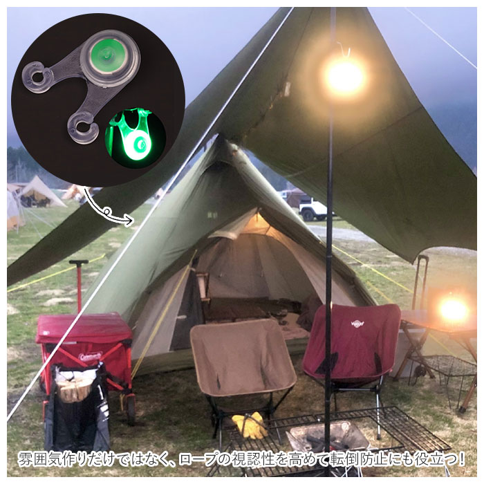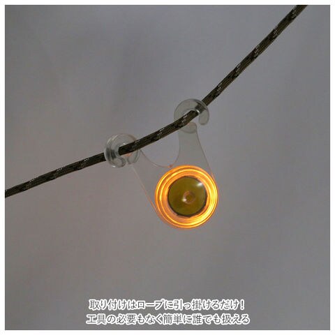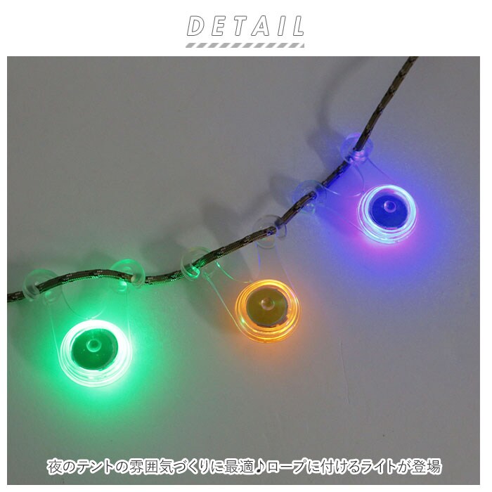 | 商品説明 | 夜のテントの雰囲気づくりに最適♪ロープに付けるライトが登場。取り付けはロープに引っ掛けるだけ!工具の必要もなく簡単に誰でも扱える。電池交換もシリコンカバーを取り外して交換できる設計。光るパターンは3通り。ボタンを1回押すと「点滅(速)」ボタンを2回押すと「点滅(遅)」ボタンを3回押すと「点灯」(※カラフルのみ点灯モードがなく代わりに色が変化するレインボーモードになります。)雰囲気作りだけではなく、ロープの視認性を高めて転倒防止にも役立つ!さらに自転車のサドルに取り付ければ夜間走行時にテールライトとしても使える。(サドルのサイズや形状によっては取り付けができない場合もあります。ご確認の上ご購入お願いします。) |