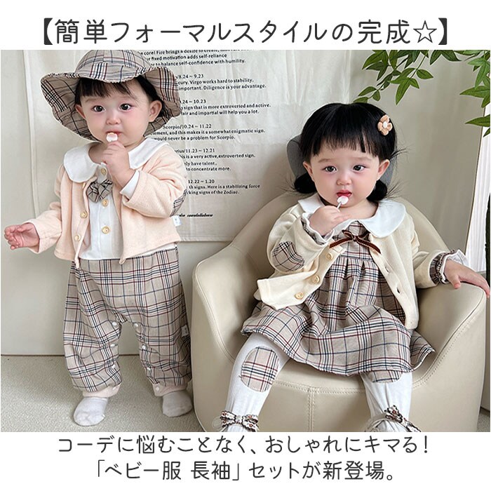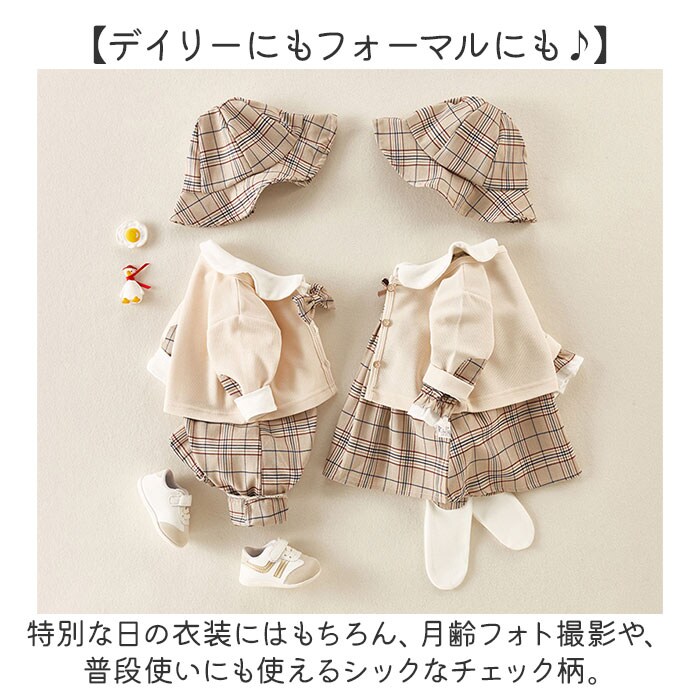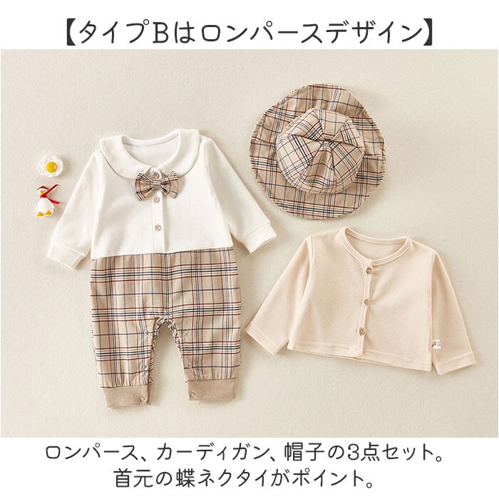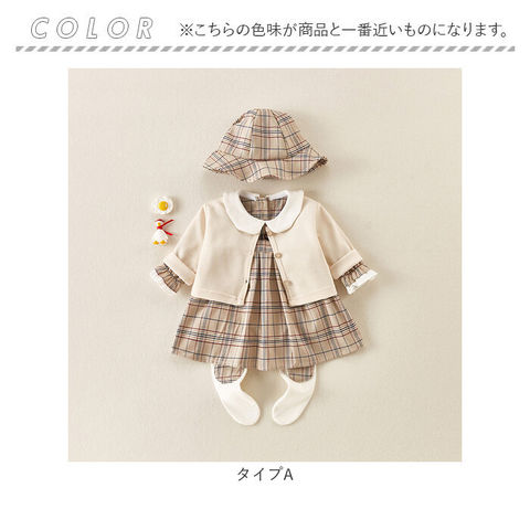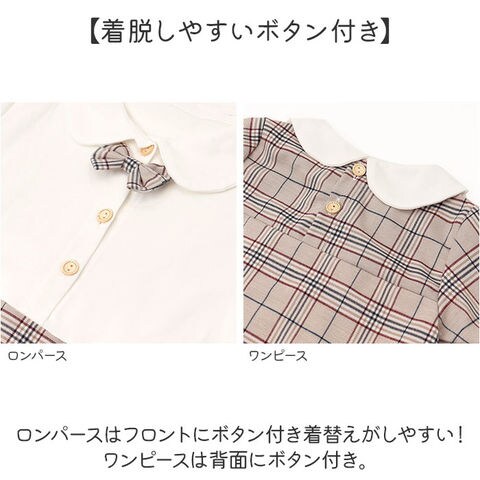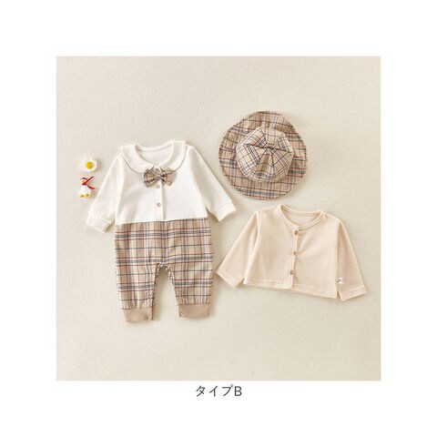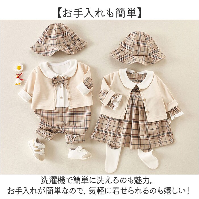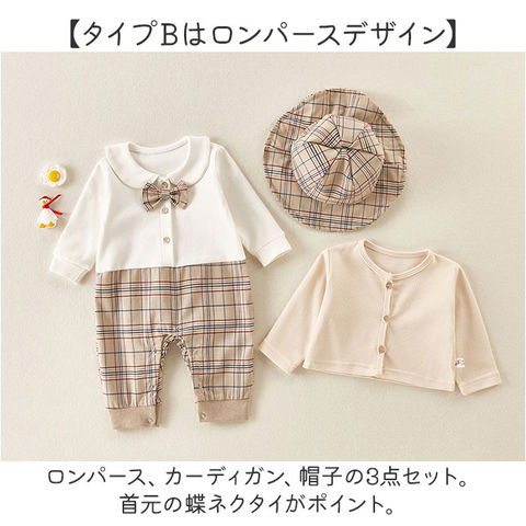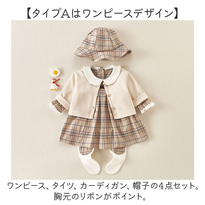 | 商品説明 | 【簡単フォーマルスタイルの完成☆】コーデに悩むことなく、おしゃれにキマる!「ベビー服 長袖」セットが新登場。【タイプAはワンピースデザイン】ワンピース、タイツ、カーディガン、帽子の4点セット。胸元のリボンがポイント。【タイプBはロンパースデザイン】ロンパース、カーディガン、帽子の3点セット。首元の蝶ネクタイがポイント。【着脱しやすいボタン付き】ワンピースは背面にボタン付き。ロンパースはフロントにボタン付き着替えがしやすい!【おむつ替えしやすいボタン付き】足部分や、股部分にはスナップボタン付きで、おむつ替えもラクラク。【お手入れも簡単】洗濯機で簡単に洗えるのも魅力。お手入れが簡単なので、気軽に着せられるのも嬉しい!【デイリーにもフォーマルにも♪】特別な日の衣装にはもちろん、月齢フォト撮影や、普段使いにも使えるシックなチェック柄。 |