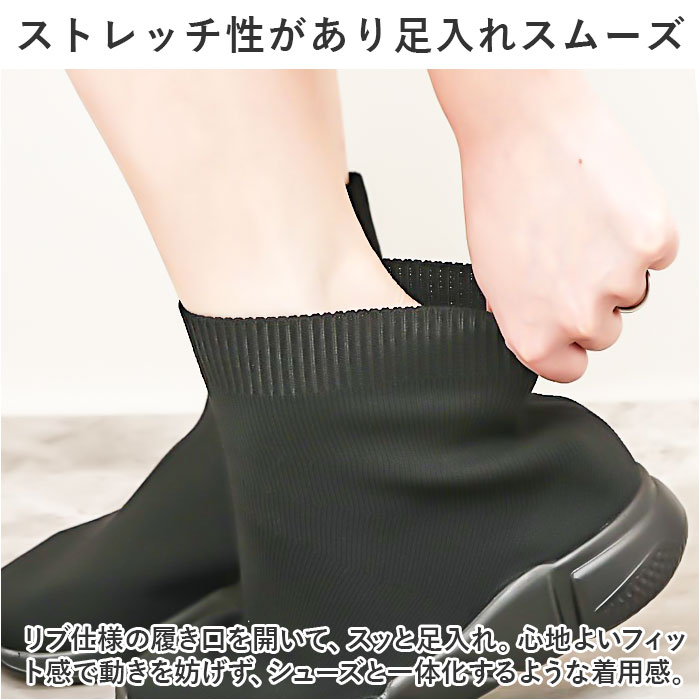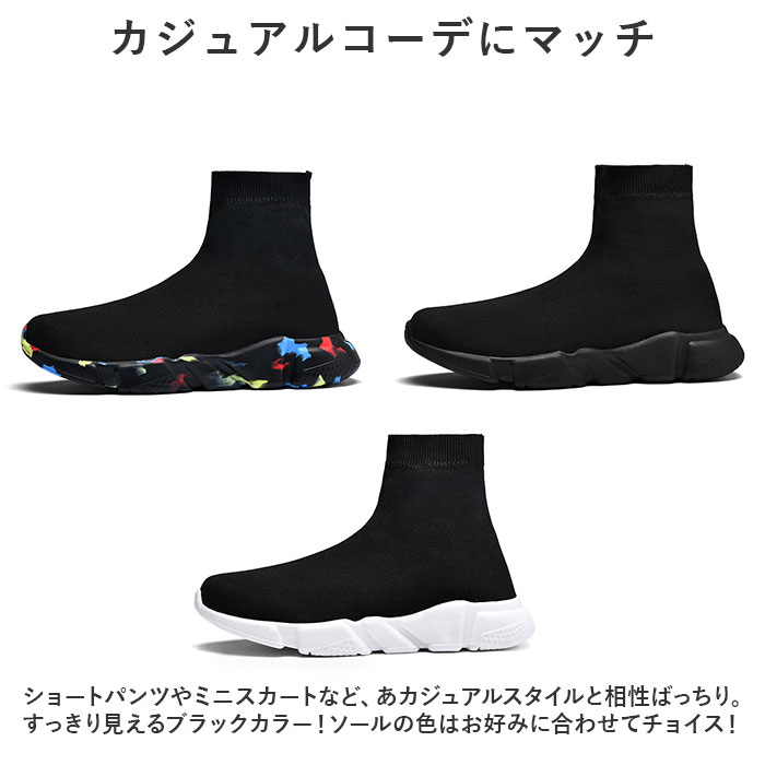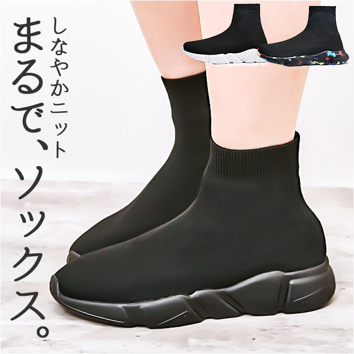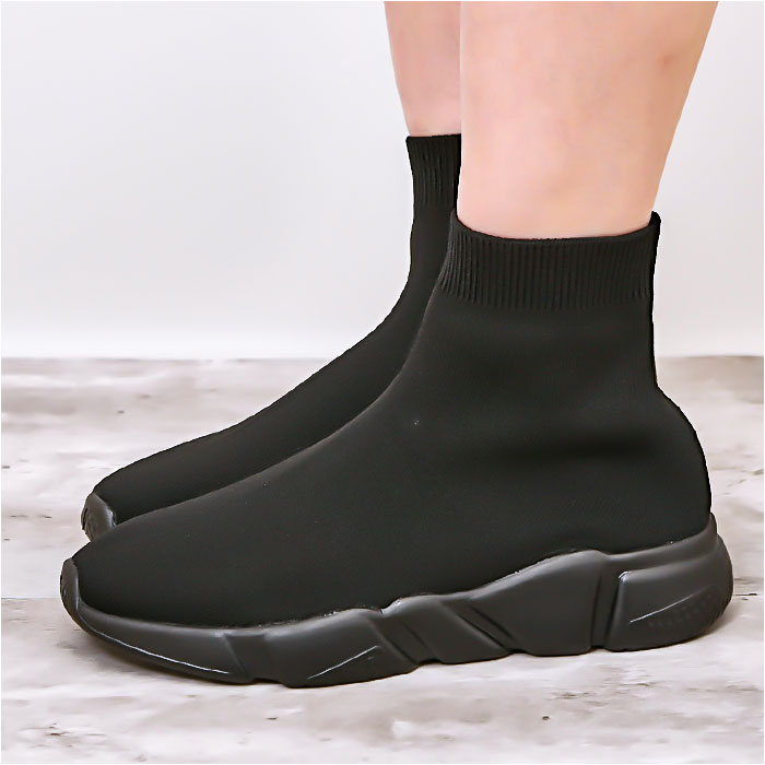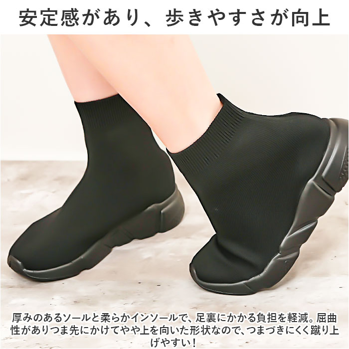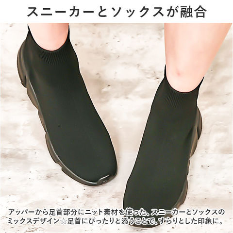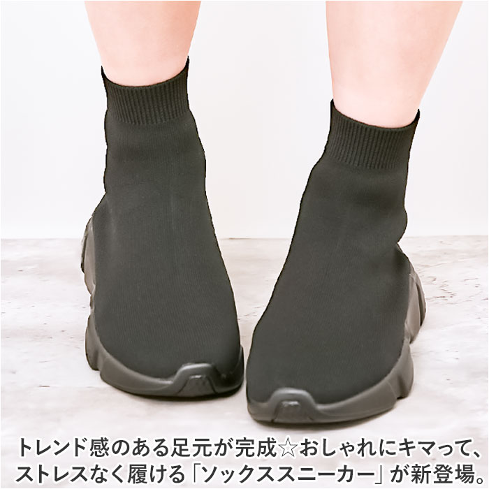 | 商品説明 | トレンド感のある足元が完成☆おしゃれにキマって、ストレスなく履ける「ソックススニーカー」が新登場。【スニーカーとソックスが融合】アッパーから足首部分にニット素材を使った、スニーカーとソックスのミックスデザイン☆足首にぴったりと添うことで、すらりとした印象に。【ストレッチ性があり足入れスムーズ】リブ仕様の履き口を開いて、スッと足入れ。心地よいフィット感で動きを妨げず、シューズと一体化するような着用感。【安定感があり、歩きやすさが向上】厚みのあるソールと柔らかインソールで、足裏にかかる負担を軽減。屈曲性がありつま先にかけてやや上を向いた形状なので、つまづきにくく蹴り上げやすい!【長時間快適な通気性】糸の間に空気の層ができることで、通気性が良く汗をかいてもムレにくい◎移動の多い日も安心。【カジュアルコーデにマッチ】ショートパンツやミニスカートなど、あカジュアルスタイルと相性ばっちり。すっきり見えるブラックカラー!ソールの色はお好みに合わせてチョイス! |