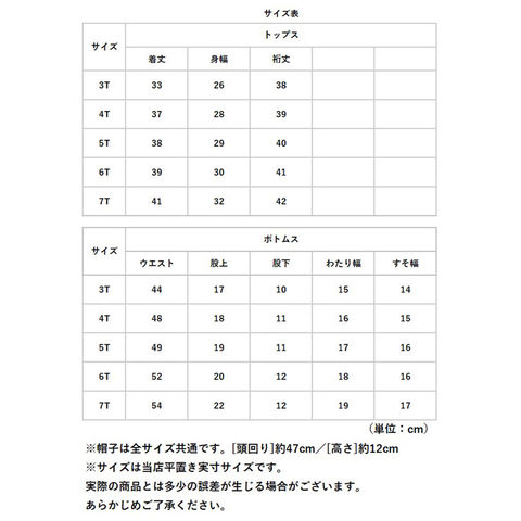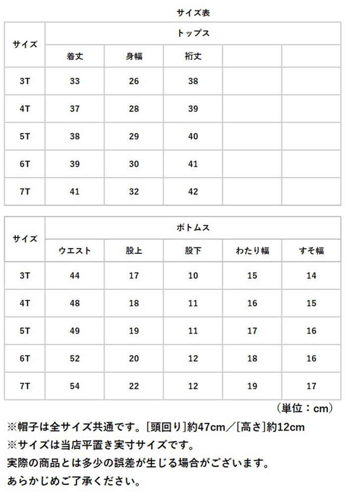 | サイズ | [キッズ] ・3T ・4T ・5T ・6T ・7T ※サイズについて詳細は、商品画像の中にあるサイズ表をご覧くださいませ。 |