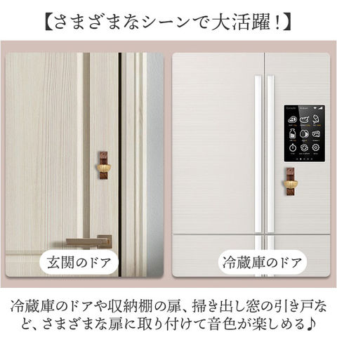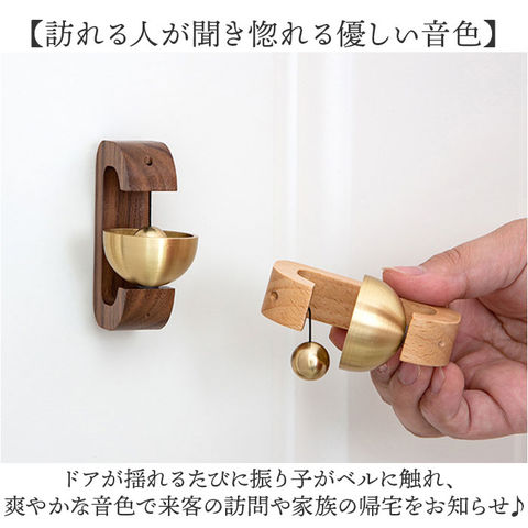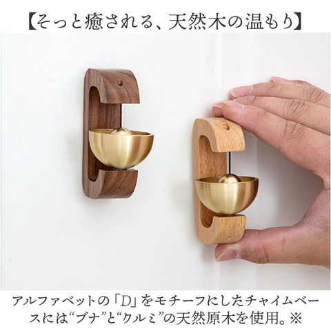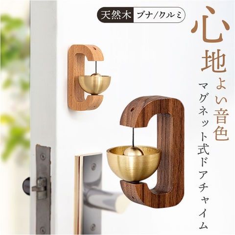 | 商品説明 | 【心地よい音色で玄関を包み込む】天然素材が奏でる澄んだ音色が来客をお知らせ!「天然木 マグネット式ドアチャイム」が新登場!【そっと癒される、天然木の温もり】アルファベットの「D」をモチーフにしたチャイムベースには“ブナ”と“クルミ”の天然原木を使用。※色味の明るいライトブラウンタイプがブナ。深みのあるブラウンがクルミです。【訪れる人が聞き惚れる優しい音色】ドアが揺れるたびに振り子がベルに触れ、爽やかな音色で来客の訪問や家族の帰宅をお知らせ♪【天然木と真鍮素材のハーモニー】半球体のベルと振り子は飴色の輝きが美しい真鍮素材。アンティーク風の素朴な素材感が魅力。【マグネットでピタッと取り付け!】スチール製ドアなど金属の扉には、ネジやビスを使用せずにマグネットの力でピタッと簡単取り付け!【扉の素材を選ばずに設置可能】木製の玄関ドアやガラス扉など、マグネットが吸着しない扉には付属の両面テープで取り付け可能。【さまざまなシーンで大活躍!】冷蔵庫のドアや収納棚の扉、掃き出し窓の引き戸など、さまざまな扉に取り付けて音色が楽しめる♪【ショップのエントランスにも】ご自宅用ドアチャイムにはもちろん、ショップのエントランスにもちょうどいいシンプルデザイン。【使うほどに深まる味わい】使うほどに素材の色彩が深まり、天然木と真鍮ならではの経年変化が楽しめるのも魅力のひとつ。【新築祝いのプチギフトにオススメ】ご家族のお出掛けもただいまも、涼やかな音色で見守るドアチャイム。新築祝いの贈り物にも最適。 |