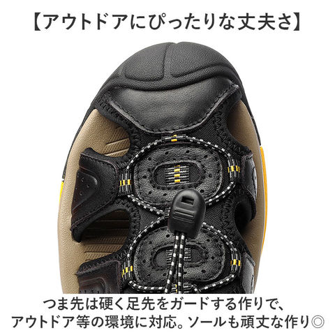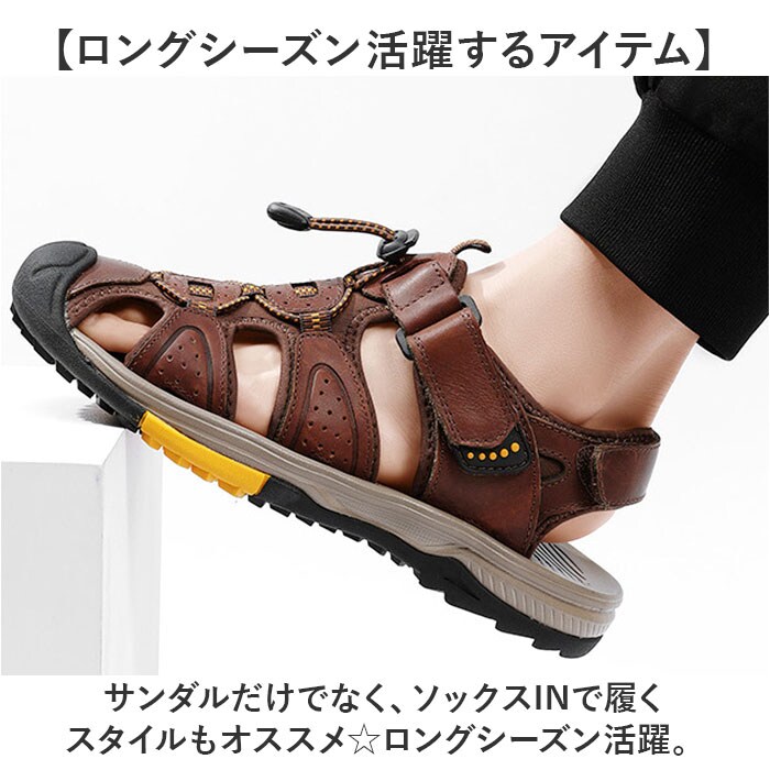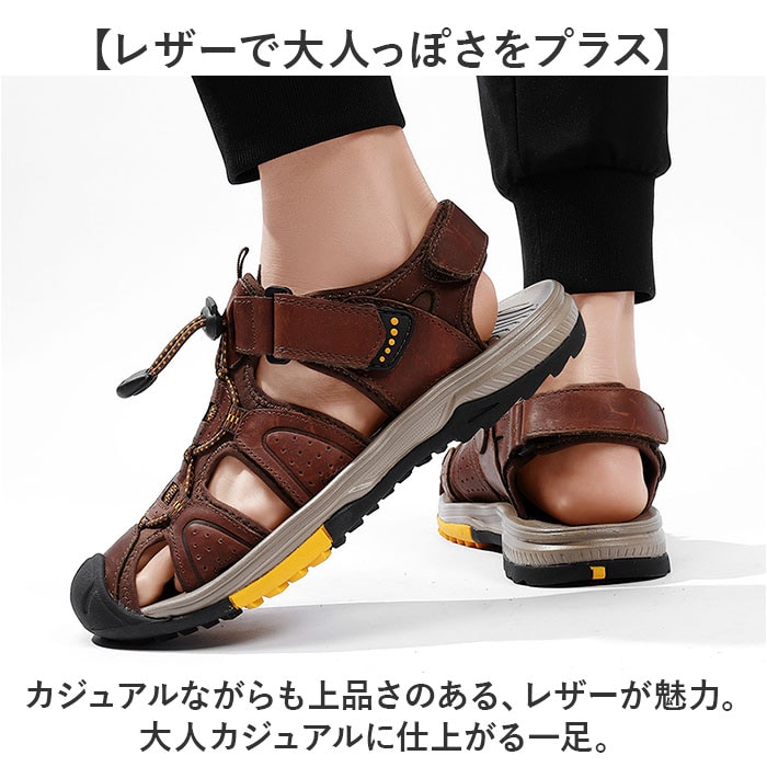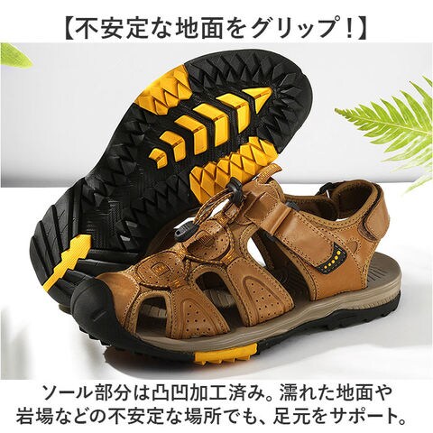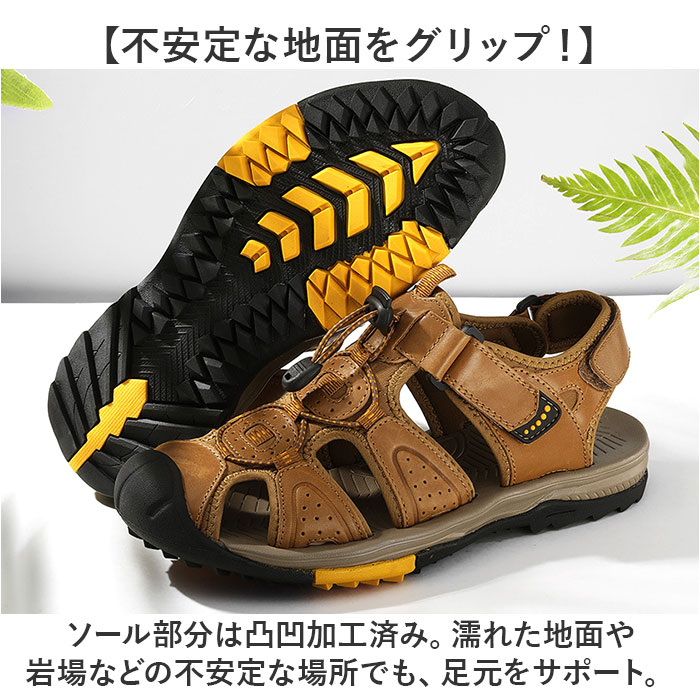 | 商品説明 | 【頑丈な作りでアウトドアに最適!】しっかりソールで地面をグリップ!「メンズ スポーツサンダル」が登場。【靴のような履き心地のサンダル】つま先まですっぽり保護する、靴のような履き心地を実現。アジャスターでFIT感を調節。【アウトドアにぴったりな丈夫さ】つま先は硬く足先をガードする作りで、アウトドア等の環境に対応。ソールも頑丈な作り◎【不安定な地面をグリップ!】ソール部分は凸凹加工済み。濡れた地面や岩場などの不安定な場所でも、足元をサポート。【レザーで大人っぽさをプラス】カジュアルながらも上品さのある、レザーが魅力。大人カジュアルに仕上がる一足。【ロングシーズン活躍するアイテム】サンダルだけでなく、ソックスINで履くスタイルもオススメ☆ロングシーズン活躍。 |