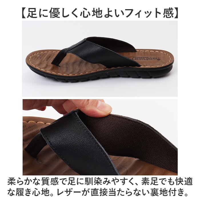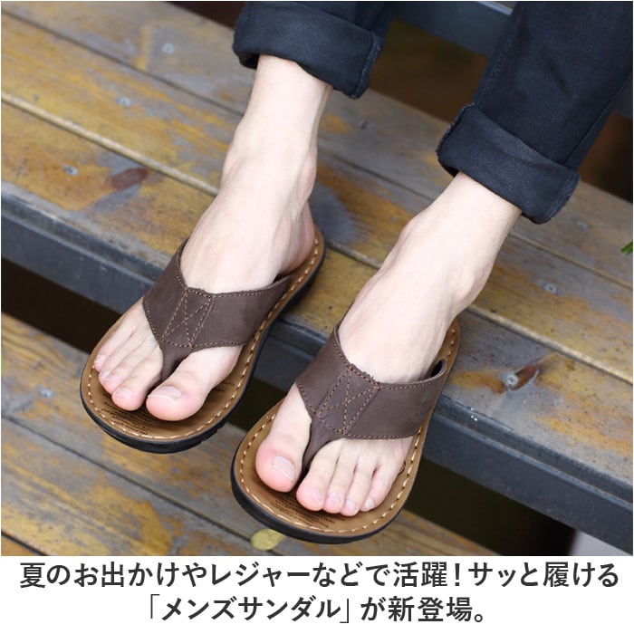 | 商品説明 | 夏のお出かけやレジャーなどで活躍!サッと履ける「メンズサンダル」が新登場。【ラフで涼しげなトングタイプ】つま先部分が下駄の鼻緒のようなフォルム。足の甲を覆わず圧迫感がないので、通気性も抜群。【タウンユースに溶け込むデザイン】スプリットレザーを使った、落ち着きのある仕上がり。どんなスタイルにも素敵にマッチ。【履き心地軽やかでストレスフリー】足に負担がかかりにくい軽量設計。長時間履いていても疲れにくいのが嬉しい◎【足に優しく心地よいフィット感】柔らかな質感で足に馴染みやすく、素足でも快適な履き心地。レザーが直接当たらない裏地付き。【足裏への負担を抑えるインソール】足裏に直接当たるインソール部分は程よく低反発で、足にかかる衝撃を吸収。【屈曲性があり、歩きやすさが向上】足の動きに合わせて曲がる!つま先部分は上向き形状で、つまづきにくく蹴り上げやすい◎【優れた柔軟性で歩行をサポート】程よく肉厚で柔軟なアウトソール。滑りにくい凹凸加工を施し、フラット形状で安定感もプラス。【多くの世代に愛されるデザイン】年代や流行にも左右されることなく愛用できる!お出かけの相棒にぴったり☆ |