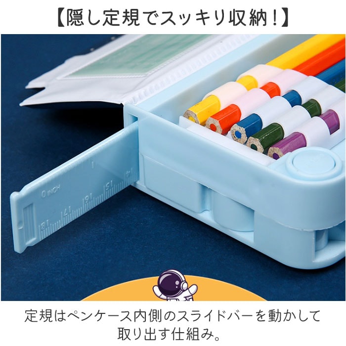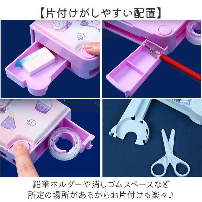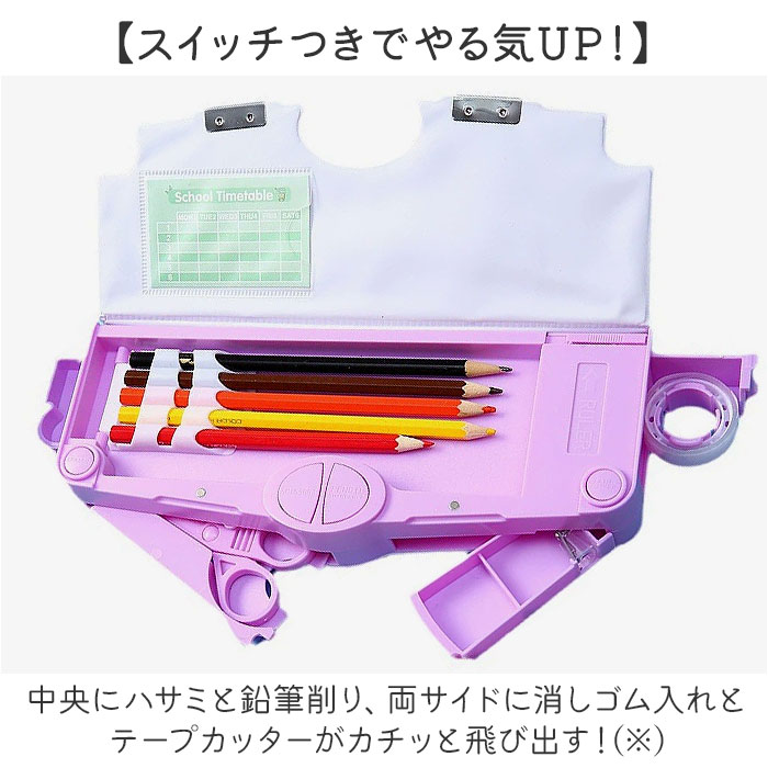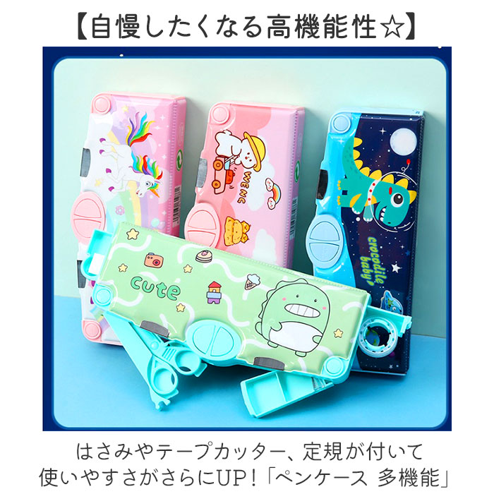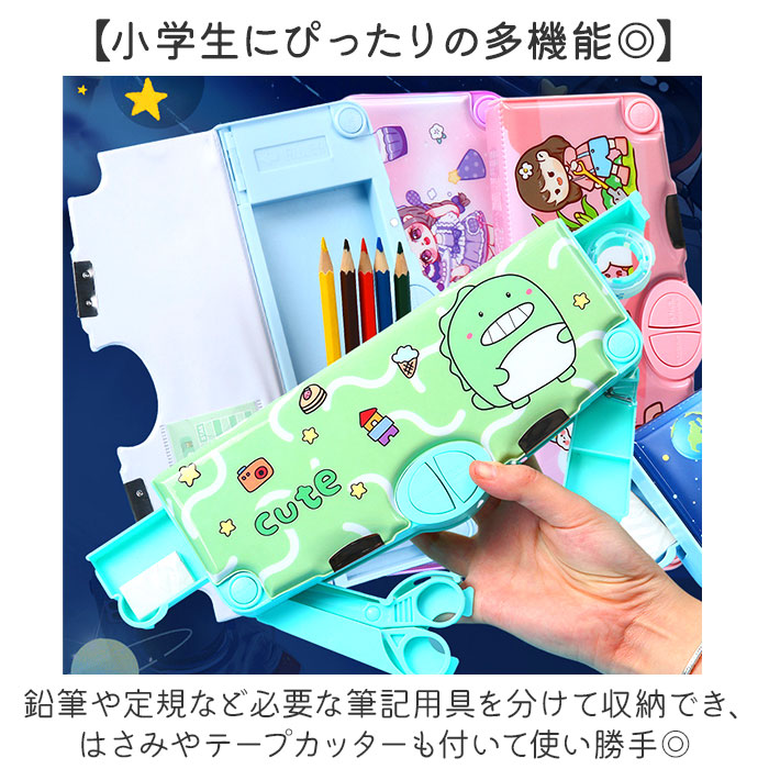 | 商品説明 | 【自慢したくなる高機能性☆】はさみやテープカッター、定規が付いて使いやすさがさらにUP!「ペンケース 多機能」【小学生にぴったりの多機能◎】鉛筆や定規など必要な筆記用具を分けて収納でき、はさみやテープカッターも付いて使い勝手◎【スイッチつきでやる気UP!】中央にハサミと鉛筆削り、両サイドに消しゴム入れとテープカッターがカチッと飛び出す!(※)勢いよく飛び出ますので、スイッチを押す際はご注意ください。【隠し定規でスッキリ収納!】定規はペンケース内側のスライドバーを動かして取り出す仕組み。【片付けがしやすい配置】鉛筆ホルダーや消しゴムスペースなど所定の場所があるからお片付けも楽々♪【パチッとマグネット式で扱いやすい】片面開きのマグネット式なので、パチッと簡単に開閉ができる。1年生でも使いやすい設計。【壊れにくい丈夫なつくり】軽量で丈夫なABS素材を使用。うっかり机から落としてしまっても壊れにくいのも嬉しい。【暗い場所で光る楽しいデザイン♪】男の子も女の子もお気に入りが見つかる、ポップでキュートなデザインがたくさん☆【ギフトにもオススメ☆】入学祝いや進級祝いの贈り物にもぴったり!実用的なアイテムだからきっと喜ばれる! |