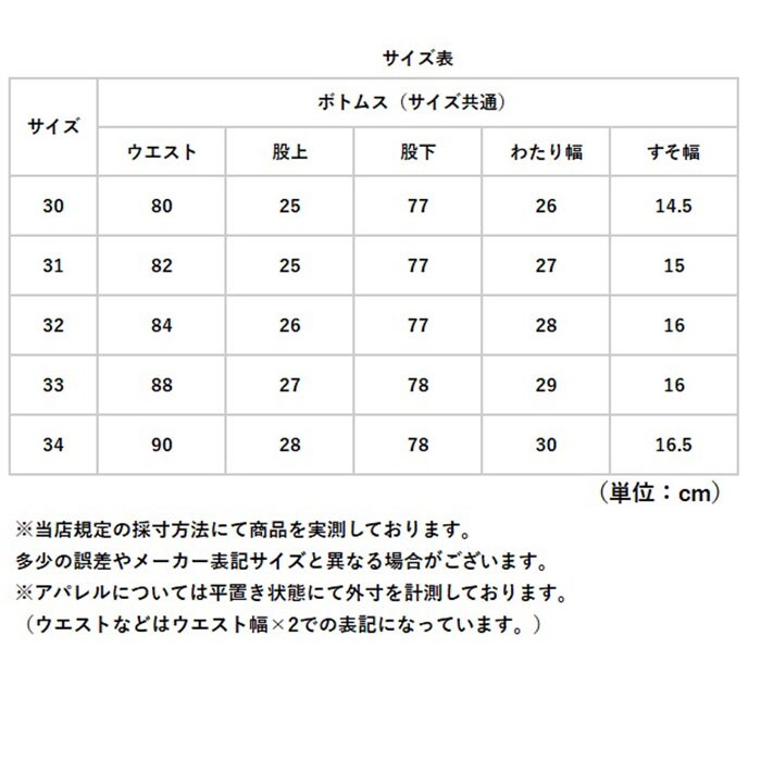 | サイズ | [メンズ] ・30サイズ ・31サイズ ・32サイズ ・33サイズ ・34サイズ ※サイズについて詳細は、商品画像の中にあるサイズ表をご覧くださいませ。 |