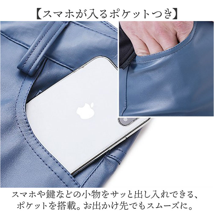 | 商品説明 | 【クールにキマる☆レザー調がGOOD!】見た目よりもラクに穿ける、ストレッチ生地。「レザーパンツ スキニー」が登場。【辛口スタイルはこれでOK!】フェイクレザーを使用したクールな印象のパンツ。いつものコーデにアクセントをON☆【スリムシルエットで細見え◎】足先に向かってスリムになるスキニーデザイン。すっきり見せしてくれるピタッとシルエット◎【1日中穿いてもストレスフリー】足にフィットするけど苦しくない、ストレッチ性のある生地を採用。しゃがみ姿勢もラクラク。【スマホが入るポケットつき】スマホや鍵などの小物をサッと出し入れできる、ポケットを搭載。お出かけ先でもスムーズに。 |