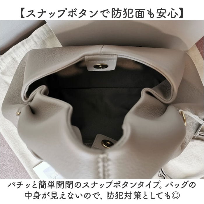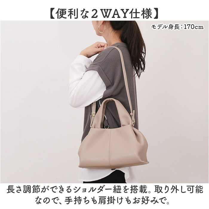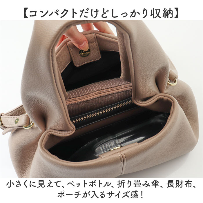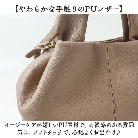 | 商品説明 | 【ころんとフォルム今っぽい♪】やわらかなレザー感で、グッと高見え!「レディースバッグ」が登場。【持つだけでこなれ感UP☆】ワイドな持ち手と、ころんとフォルム。くしゅっとした遊びをプラスした、上級者アイテム。【やわらかな手触りのPUレザー】イージーケアが嬉しいPU素材で、高級感のある雰囲気に。ソフトタッチで、心地よくお出かけ♪【便利な2WAY仕様】長さ調節ができるショルダー紐を搭載。取り外し可能なので、手持ちも肩掛けもお好みで。【スナップボタンで防犯面も安心】パチッと簡単開閉のスナップボタンタイプ。バッグの中身が見えないので、防犯対策としても◎【コンパクトだけどしっかり収納】小さくに見えて、ペットボトル、折り畳み傘、長財布、ポーチが入るサイズ感!【幅広いシーンで使えちゃう!】カジュアル、オフィス、オケージョン全ておまかせ!お好みのカラーをチョイス☆【ポケット仕様】メイン収納:ファスナーポケット×1 |