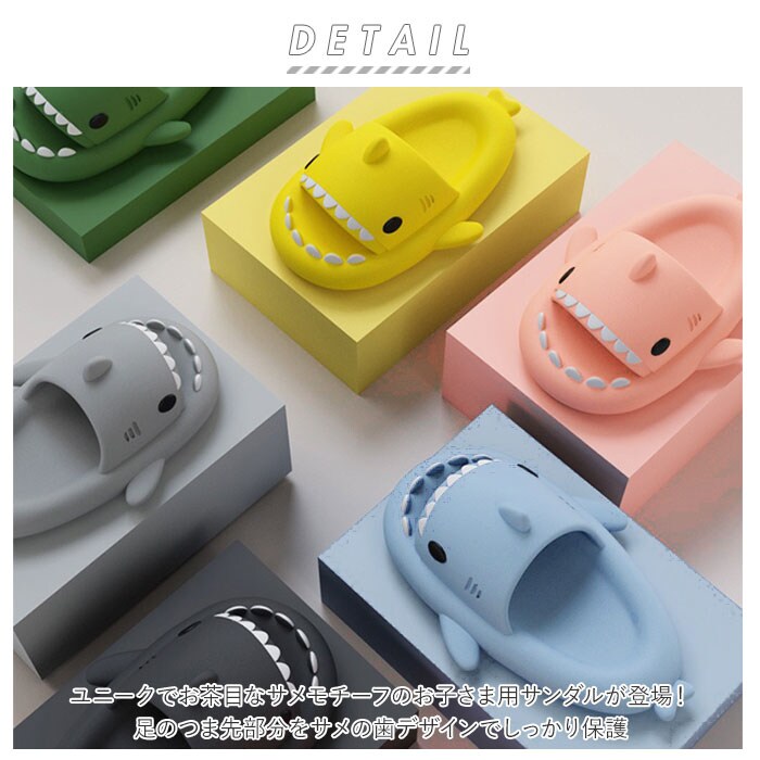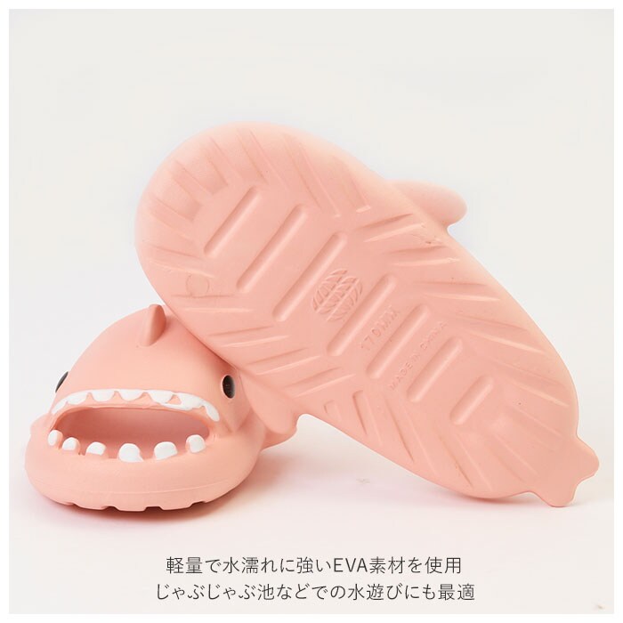 | 商品説明 | ユニークでお茶目なサメモチーフのお子さま用サンダルが登場!足のつま先部分をサメの歯デザインでしっかり保護。クッション性のある約3cmのソールは安定感があり、足の疲れを軽減。軽量で水濡れに強いEVA素材を使用。じゃぶじゃぶ池などでの水遊びにも最適。汚れが気になったら水洗いOK!お手入れがラクチンなのも嬉しいポイント。柔らかく床が傷つきにくいので、室内履きとして使ってもOK。豊富なカラーからお子さまのお気に入りの一足を★ |