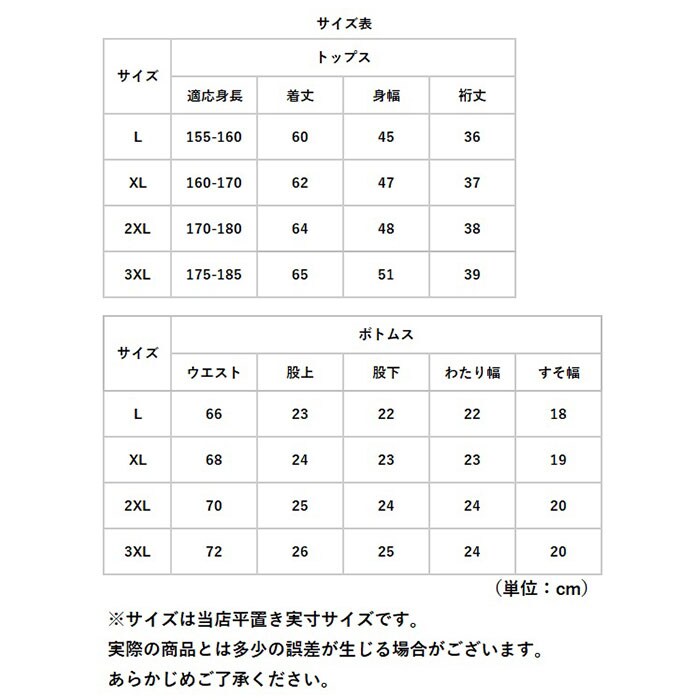 | 重量 | 約270g(※XLサイズの商品上下セットの重量です。) |