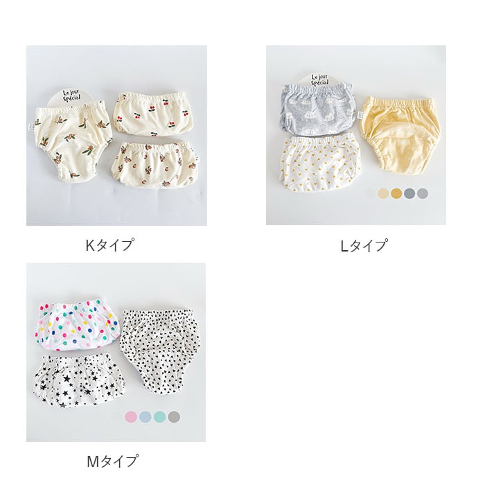 | 商品説明 | おむつからパンツへのステップアップに♪ベビー用トレーニングパンツ(3枚セット)。デリケートな赤ちゃんの肌に優しい綿100%生地で仕上げ、滑らかな肌触りで履き心地も快適。クロッチ部分はふんわり6層ガーゼがおしっこを素早く吸収。程よく通気性も確保し、不快なムレを軽減。ウエストは幅広でぐ~んと伸びる総ゴム仕様で、ベビーに穿かせやすく、ズレ落ちだって気にならない♪お腹周りまですっぽりと包み込む立体設計で、赤ちゃんのおしりにぴったりとフィット!さらに、足回りにはゴム入りギャザーが付いているから、おしっこの漏れもしっかり防止。Mサイズ(90cm)~Lサイズ(100cm)の選べる2タイプ。ポップで可愛らしい柄のお気に入りパンツで、楽しくトイレトレーニング♪パンツの着脱トレーニングにもオススメ。 |