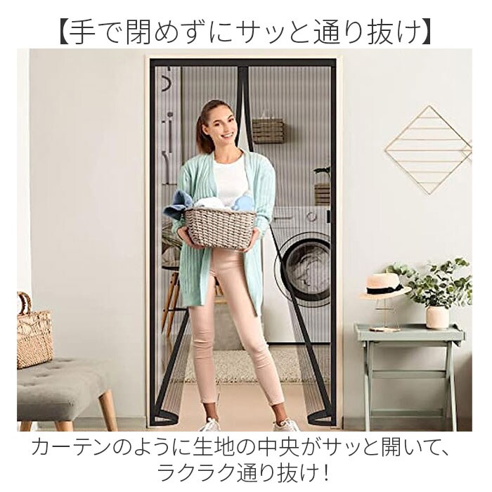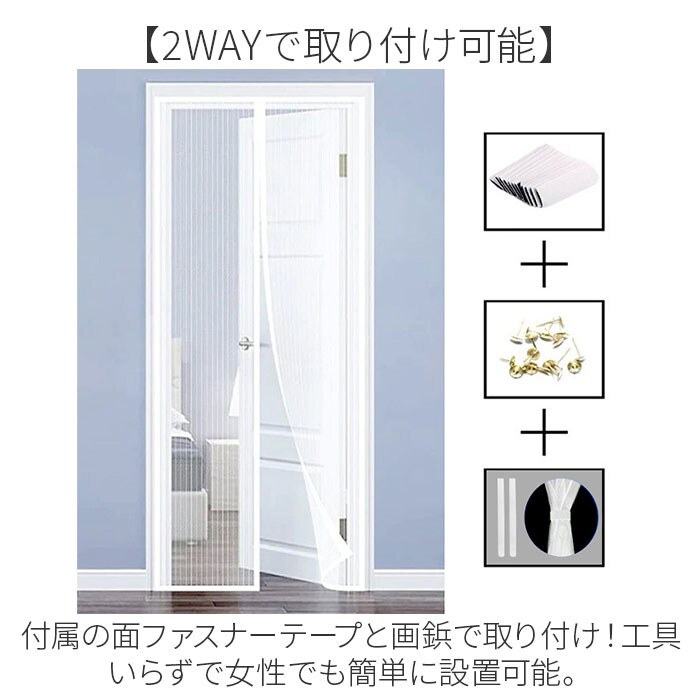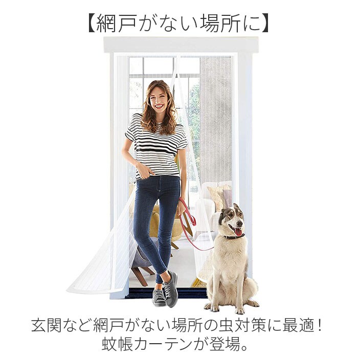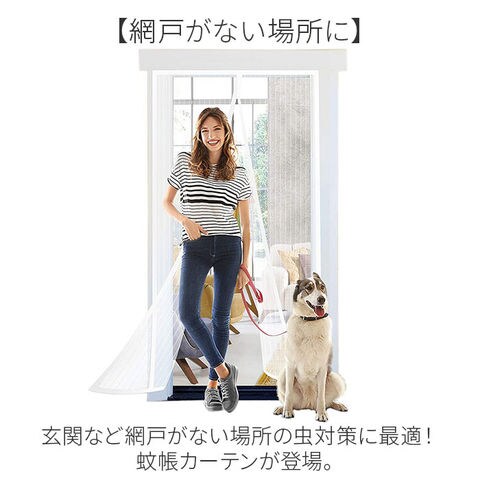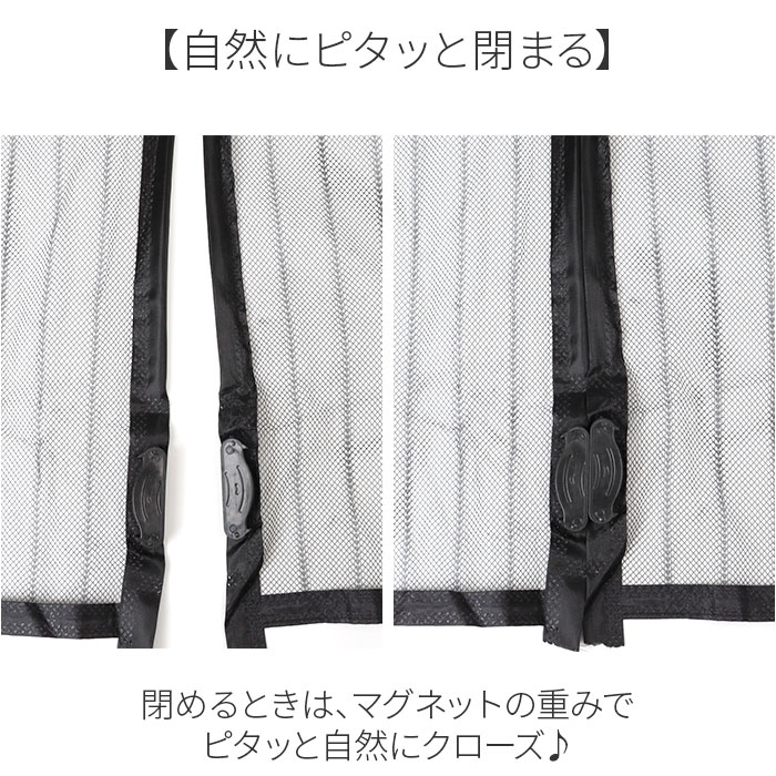 | 商品説明 | 【網戸がない場所に】玄関など網戸がない場所の虫対策に最適!蚊帳カーテンが登場。【2WAYで取り付け可能】付属の面ファスナーテープと画鋲で取り付け!工具いらずで女性でも簡単に設置可能。【小さな虫や埃のお悩みを解決!】自然な風をお部屋に取り入れてこまめに換気したいけれど、虫や埃が気になる方にオススメ♪【手で閉めずにサッと通り抜け】カーテンのように生地の中央がサッと開いて、ラクラク通り抜け!【自然にピタッと閉まる】閉めるときは、マグネットの重みでピタッと自然にクローズ♪【風通し抜群】目が大きいメッシュ生地を使用することにより、より風通しがよく涼しく感じる◎ |