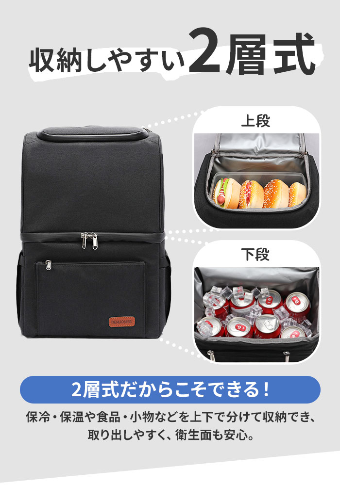 | 商品説明 | いつものお買い物やレジャーにぴったり!保冷保温機能付き2層リュックが登場。【2層構造のボックス型】上下2層式のメインルーム開口部は、ラウンド型に大きく開くダブルファスナー式。荷物が入っていない状態でも自立するので、出し入れラクラク!【うれしい保冷保温機能付き】内側はクッション性があり、保冷・保温効果のあるシルバーコーティング加工済み。生鮮食品や冷凍食品、温かいお弁当の持ち運びに最適。【底マチ設計】ランチボックスやタッパーも、安定した状態をキープ◎【お手入れラクチン】シルバーコーティング部分は、汚れや水滴もサッと拭き取るだけでOK。【小物の収納に】前面のファスナーポケットには、スマホなどの小物をIN。【伸縮性のあるサイドポケット】両サイドに配置されたポケットは、伸縮性のあるゴム入り。ペットボトルなどを入れておけば、サッと取り出せて便利。【背負い心地快適】背面&ショルダーベルトはムレにくいメッシュ素材。程よいクッション性もあり、体にかかる負担を軽減。【栓抜きを装備】ショルダーベルト部分の栓抜きは、アウトドアシーンで活躍。【ちょっとの雨なら大丈夫】表面に水滴や汚れを弾く、はっ水加工済み。(※完全防水ではありません。)【ポケット仕様】前面:ファスナーポケット×1サイド:ゴム入りオープンポケット×2 |