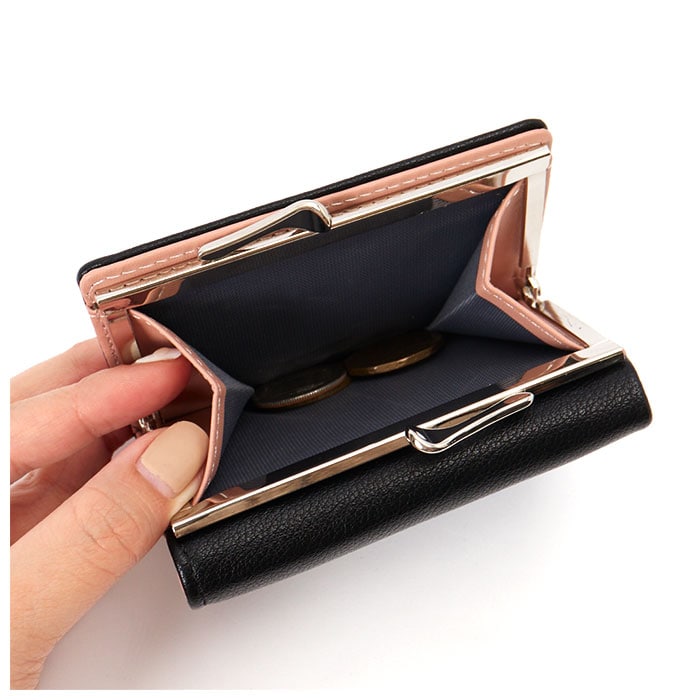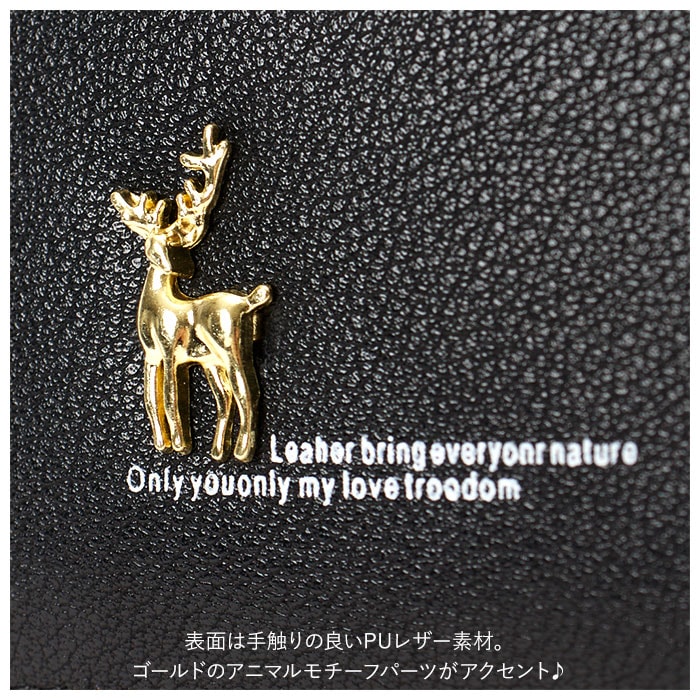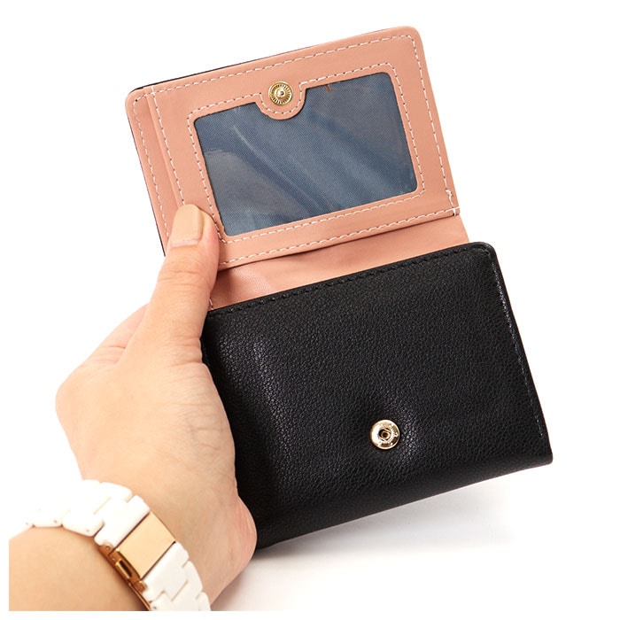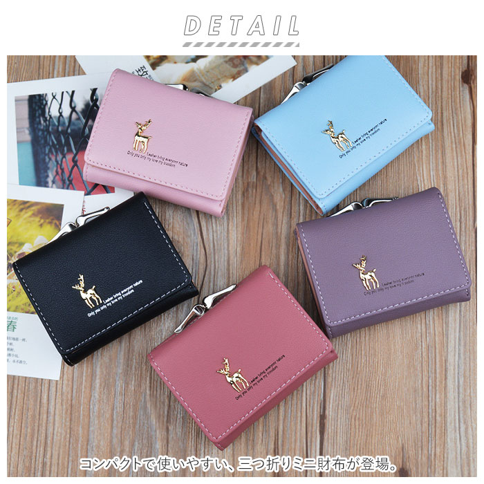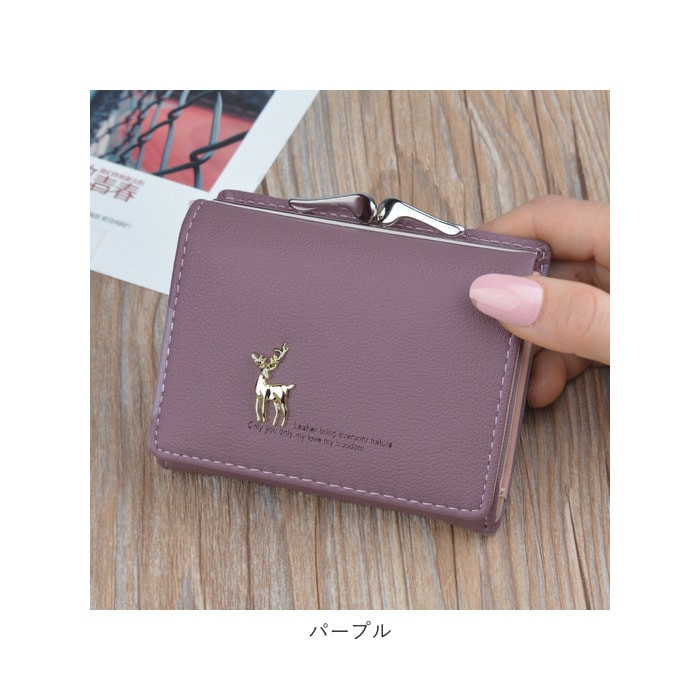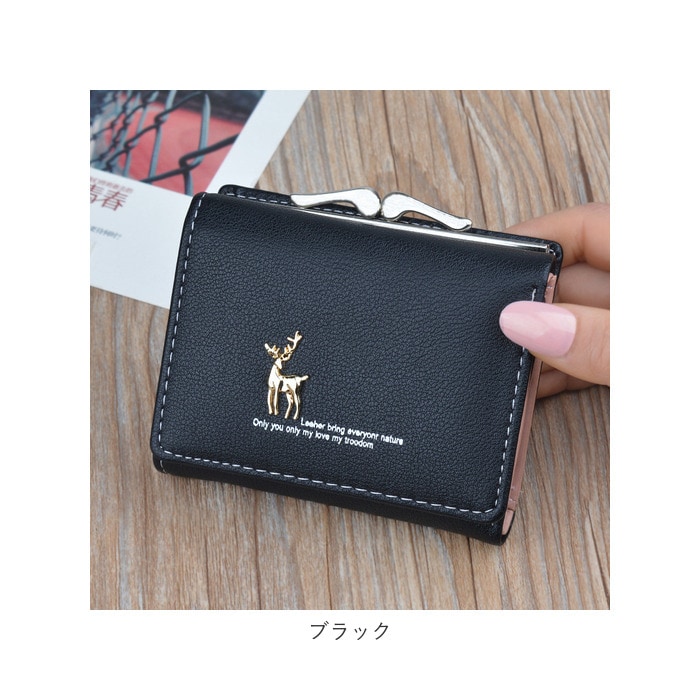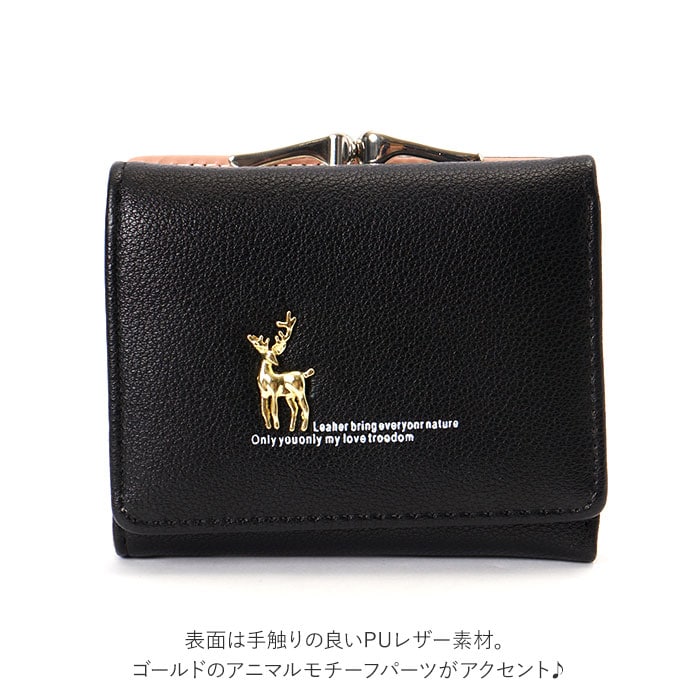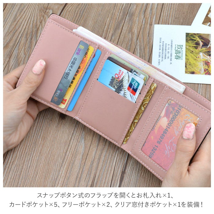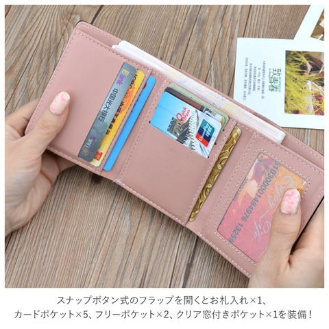 | 商品説明 | コンパクトで使いやすい、三つ折りミニ財布が登場。表面は手触りの良いPUレザー素材。ゴールドのアニマルモチーフパーツがアクセント♪小銭入れはがま口式。サッと開いて、小銭の出し入れがラクラク。スナップボタン式のフラップを開くとお札入れ×1、カードポケット×5、フリーポケット×2、クリア窓付きポケット×1を装備!ミニバッグにもすっぽり収まるサイズ感◎幅広い年代で使えるシンプルなデザイン♪ |
