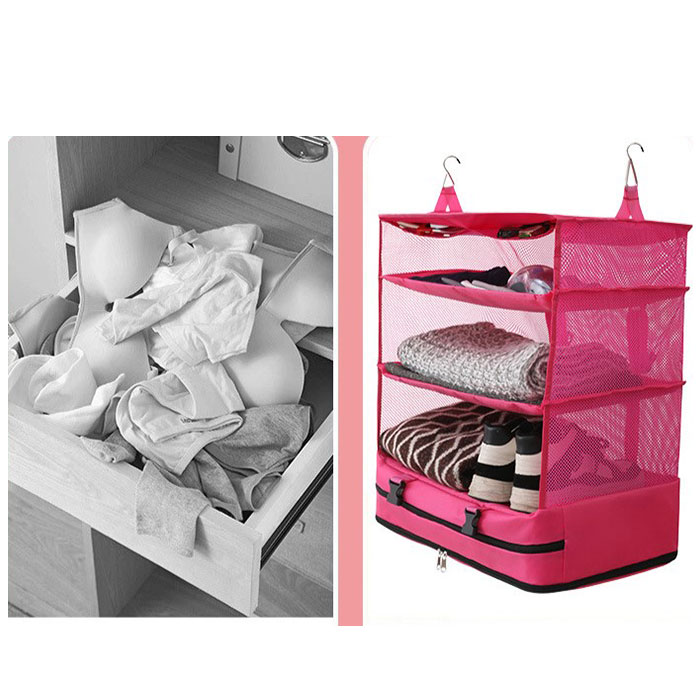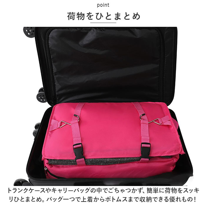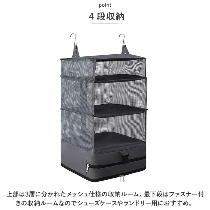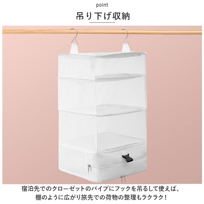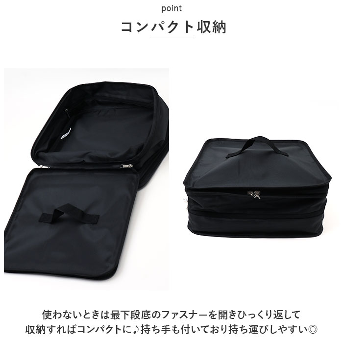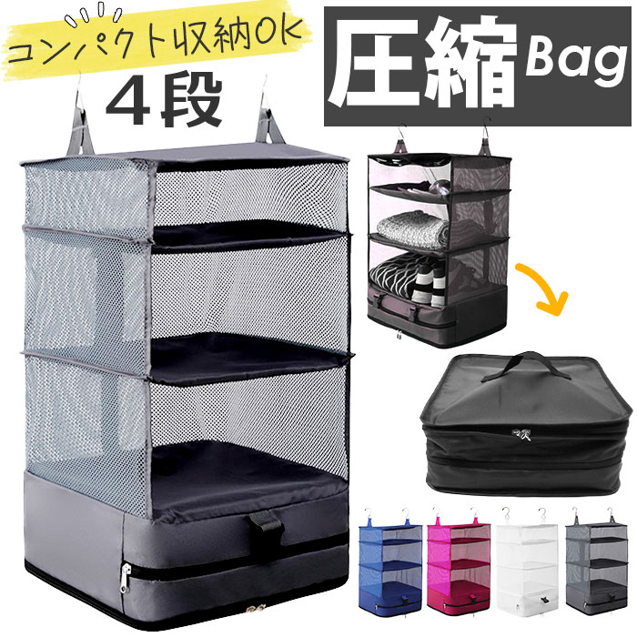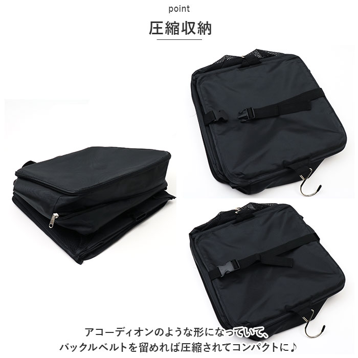 | 商品説明 | 旅行や出張で必要な衣類などをコンパクトにまとめて収納♪圧縮バッグが登場。【4段収納】上部は3層に分かれたメッシュ仕様の収納ルーム。最下段はファスナー付きの収納ルームなのでシューズケースやランドリー用におすすめ。【オープンポケット付き】最上段にオープンポケットが2つ付いており、洗面用品など細かい物も分けて収納可能!【圧縮収納】アコーディオンのような形になっていて、バックルベルトを留めれば圧縮されてコンパクトに♪【コンパクト収納】使わないときは最下段底のファスナーを開きひっくり返して収納すればコンパクトに♪持ち手も付いており持ち運びしやすい◎【吊り下げ収納】宿泊先でのクローゼットのパイプにフックを吊るして使えば、棚のように広がり旅先での荷物の整理もラクラク!【荷物をひとまとめ】トランクケースやキャリーバッグの中でごちゃつかず、簡単に荷物をスッキリひとまとめ。バッグ一つで上着からボトムスまで収納できる優れもの! |