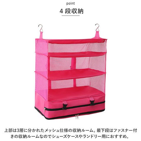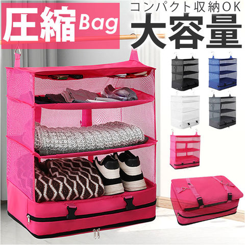 | 商品説明 | 旅行や出張で必要な衣類などをコンパクトにまとめて収納♪圧縮バッグ 大容量タイプが登場。【4段収納】上部は3層に分かれたメッシュ仕様の収納ルーム。最下段はファスナー付きの収納ルームなのでシューズケースやランドリー用におすすめ。【オープンポケット付き】最上段にオープンポケットが2つ付いており、洗面用品など細かい物も分けて収納可能!【圧縮収納】アコーディオンのような形になっていて、バックルベルトを留めれば圧縮されてコンパクトに♪【コンパクト収納】使わないときは最下段底のファスナーを開きひっくり返して収納すればコンパクトに♪持ち手も付いており持ち運びしやすい◎【吊り下げ収納】宿泊先でのクローゼットのパイプにフックを吊るして使えば、棚のように広がり旅先での荷物の整理もラクラク!【荷物をひとまとめ】トランクケースやキャリーバッグの中でごちゃつかず、簡単に荷物をスッキリひとまとめ。バッグ一つで上着からボトムスまで収納できる優れもの! |