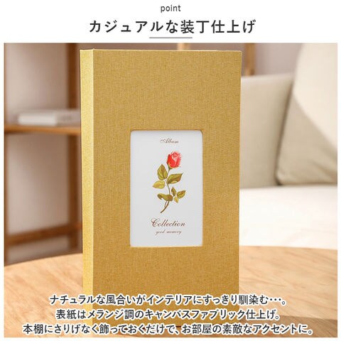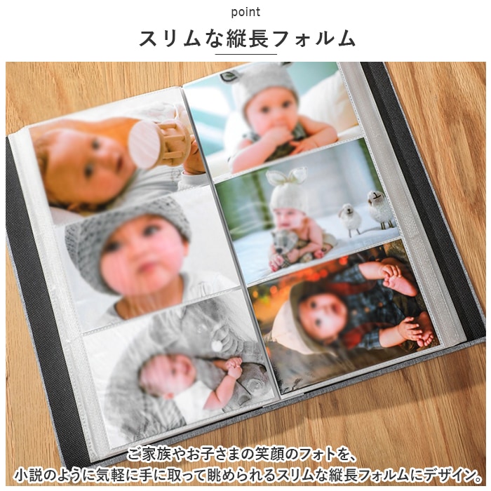 | 商品説明 | 思い出のフォトを温かみのあるブックにひとまとめ!L判写真を最大で300枚収納できる、大容量フォトアルバム。【L判ならたっぷり300枚】L判サイズ(89mm×127mm)の写真が見開きで6枚、全100ページのクリアポケットに合計300枚収納することができる大容量タイプ。【ポストカードの整理にも◎】L判サイズの写真はもちろん、一般的なはがき・ポストカードサイズ(100mm×148mm)にも対応しているので、年賀状やポストカードの整理にもオススメ。(※オリジナルポストカードなどサイズによって収納できない場合がございます。)【アレンジ自在・フォトウィンドウ】表紙のフォトウィンドウにキャッチーな写真を入れておけば、記念日やイベントごと、旅行のフォトなら旅先ごとに、アルバムの整理や分類も楽ちん。【カジュアルな装丁仕上げ】ナチュラルな風合いがインテリアにすっきり馴染む・・・。表紙はメランジ調のキャンバスファブリック仕上げ。本棚にさりげなく飾っておくだけで、お部屋の素敵なアクセントに。【スリムな縦長フォルム】ご家族やお子さまの笑顔のフォトを、小説のように気軽に手に取って眺められるスリムな縦長フォルムにデザイン。 |