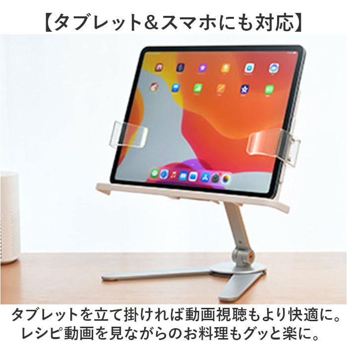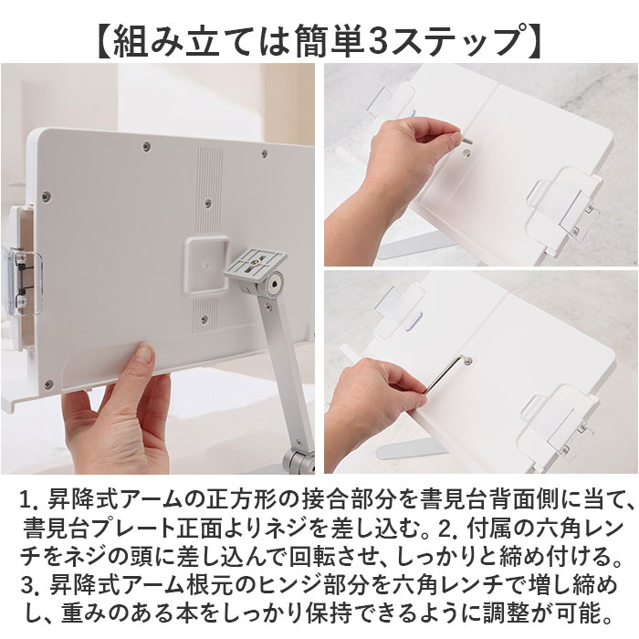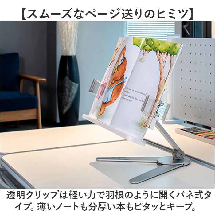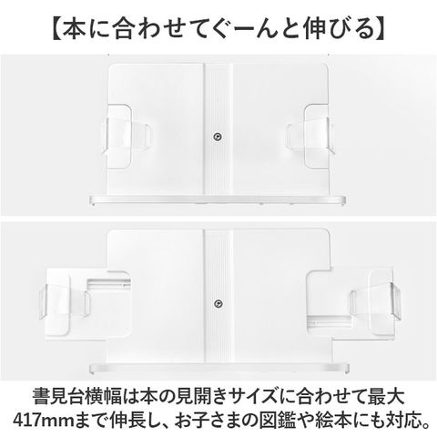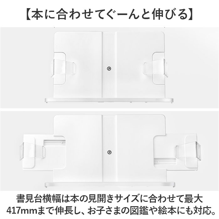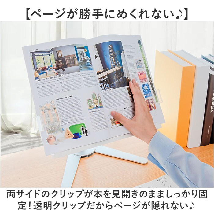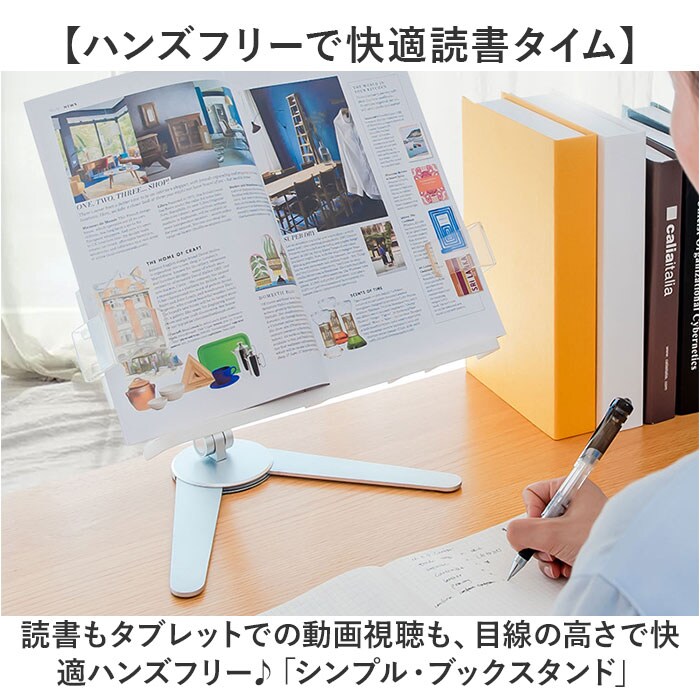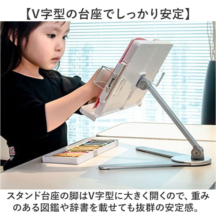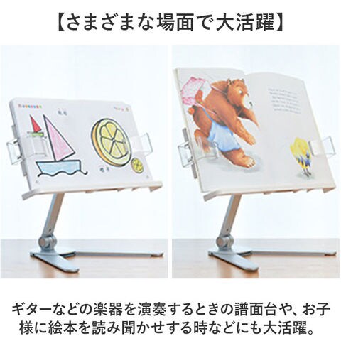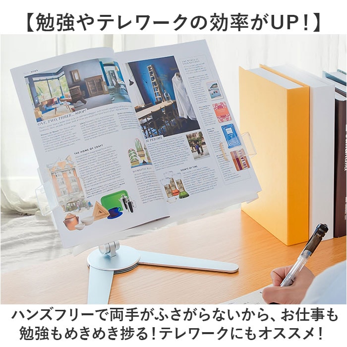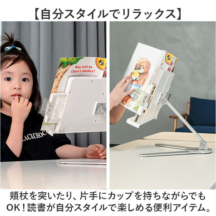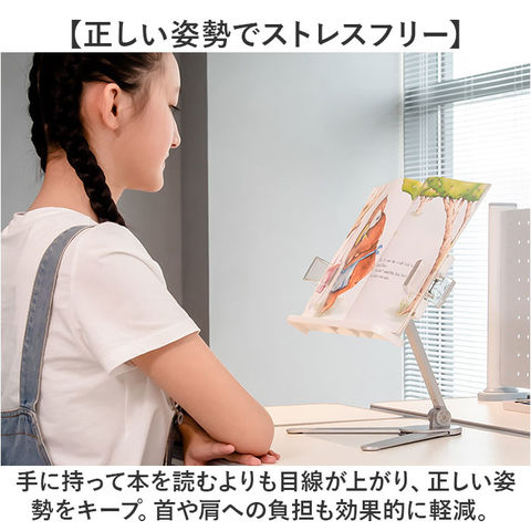 | 商品説明 | 【ハンズフリーで快適読書タイム】読書もタブレットでの動画視聴も、目線の高さで快適ハンズフリー♪「シンプル・ブックスタンド」【目線の高さにピタ!2つの角度調整】背面の昇降式アームの高さと書見台の首振り角度で、一番見やすいポジションに調節が自由自在。【ページが勝手にめくれない♪】両サイドのクリップが本を見開きのまましっかり固定!透明クリップだからページが隠れない♪【スムーズなぺージ送りのヒミツ】透明クリップは軽い力で羽根のように開くバネ式タイプ。薄いノートも分厚い本もピタッとキープ。【本に合わせてぐーんと伸びる】書見台横幅は本の見開きサイズに合わせて最大417mmまで伸長し、お子さまの図鑑や絵本にも対応。【V字型の台座でしっかり安定】スタンド台座の脚はV字型に大きく開くので、重みのある図鑑や辞書を載せても抜群の安定感。【グラつき防止滑り止めパッド】台座底面の滑り止め防止パッドの働きで、スタンドがグラつかず、軽快なページ送りを実現。【正しい姿勢でストレスフリー】手に持って本を読むよりも目線が上がり、正しい姿勢をキープ。首や肩への負担も効果的に軽減。【勉強やテレワークの効率がUP!】ハンズフリーで両手がふさがらないから、お仕事も勉強もめきめき捗る!テレワークにもオススメ!【タブレット&スマホにも対応】タブレットを立て掛ければ動画視聴もより快適に。レシピ動画を見ながらのお料理もグッと楽に。【さまざまな場面で大活躍】ギターなどの楽器を演奏するときの譜面台や、お子様に絵本を読み聞かせする時などにも大活躍。【自分スタイルでリラックス】頬杖を突いたり、片手にカップを持ちながらでもOK!読書が自分スタイルで楽しめる便利アイテム。【組み立ては簡単3ステップ】1.昇降式アームの正方形の接合部分を書見台背面側に当て、書見台プレート正面よりネジを差し込む。2.付属の六角レンチをネジの頭に差し込んで回転させ、しっかりと締め付ける。3.昇降式アーム根元のヒンジ部分を六角レンチで増し締めし、重みのある本をしっかり保持できるように調整が可能。 |