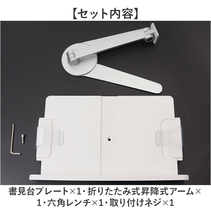 | 注意点 | 【セット内容】・書見台プレート×1・折りたたみ式昇降式アーム×1・六角レンチ×1・取り付けネジ×1海外輸入品のため、商品によってはパッケージや説明書が、英語や中国語表記となっている場合があります。商品を安価でご提供させていただくため、輸入時のパッケージのままでのお届けとなります。予めご了承くださいませ。海外輸入品のため、パッケージに破れ、傷やへこみがある場合がございます。本体には問題ございませんので、予めご了承くださいませ。商品の写真はできる限り実物のお色に近づけるように加工しておりますが、お使いのモニター設定、お部屋の照明などにより、実際の商品と異なる場合がございます。商品や個体差などにより、表記と若干異なる場合がございますが、予めご了承くださいませ。採寸方法の違いにより、多少の誤差がある場合がございます。こちらの商品本体、及び商品についている印字やタグに関しては、海外メーカー独自のサイズ情報や表記になります。実際には、当社にて日本向けに正しい情報をページに掲載させて頂いております。 |