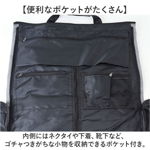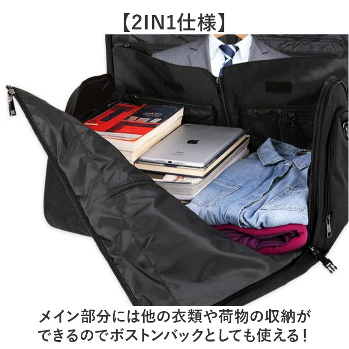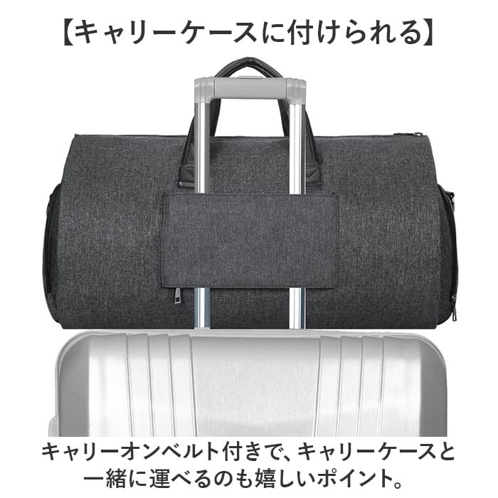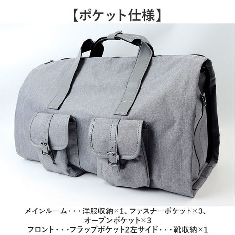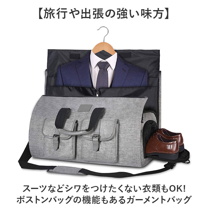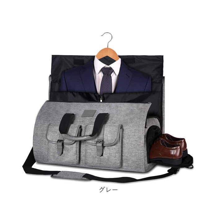 | 商品説明 | 【旅行や出張の強い味方】スーツなどシワをつけたくない衣類もOK!ボストンバッグの機能もあるガーメントバッグ【2IN1仕様】メイン部分には他の衣類や荷物の収納ができるのでボストンバックとしても使える!【ハンガーのまま収納OK】ハンガーフックを通すループ付きなので、スーツやドレスなどをハンガーのまま収納OK【靴専用スペースあり】外側には靴専用のスペースあり!独立スペースなので他の荷物を汚すことなく靴を収納できる!【便利なポケットがたくさん】内側にはネクタイや下着、靴下など、ゴチャつきがちな小物を収納できるポケット付き。【すぐに取り出したい小物入れに】フロントにはスマホやカードケースなどすぐに取り出したい小物入れに最適なポケット。【調節可能なショルダーベルト付き】取り外し可能なショルダーパット付きのベルトがあるのでショルダーにもでき持ち運び楽ちん【キャリーケースに付けられる】キャリーオンベルト付きで、キャリーケースと一緒に運べるのも嬉しいポイント。【底鋲付き】5点の底鋲付きなので、バッグの底が汚れにくい!自立してくれるので使いやすい◎【バッグの広がりを防ぐ】サイドのファスナーはカチッとロックできるフック付き。移動中のバッグの広がりを防ぐ♪【折り畳んで収納可能】柔らかい生地でできており、使わない時は折り畳んでクローゼットなどの収納に気軽にIN【ポケット仕様】メインルーム・・・洋服収納×1、ファスナーポケット×3、オープンポケット×3フロント・・・フラップポケット2左サイド・・・靴収納×1 |