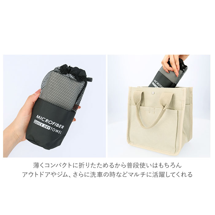 | 商品説明 | マイクロファイバーを使用した速乾タオルが登場。一般的なタオル生地より3倍の吸水性を持つマイクロファイバー生地!マイクロファイバーは速乾性もあり乾きが早くサラサラで快適な使用感。さらに部屋干ししてもすぐ乾くから、嫌なにおいが発生しにくい。柔らかい肌触りで小さなお子様にも使用できる◎薄くコンパクトに折りたためるから普段使いはもちろん、アウトドアやジム、さらに洗車の時などマルチに活躍してくれる。便利な収納袋付き。 |