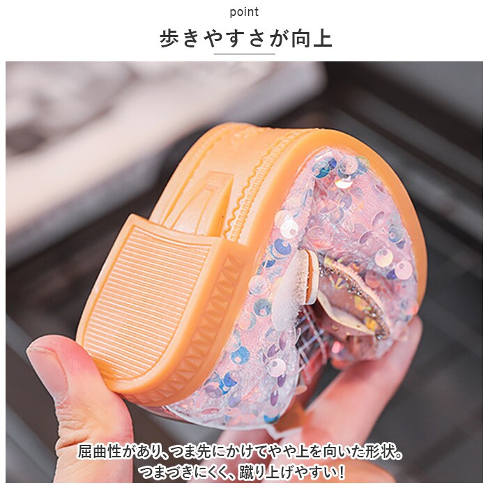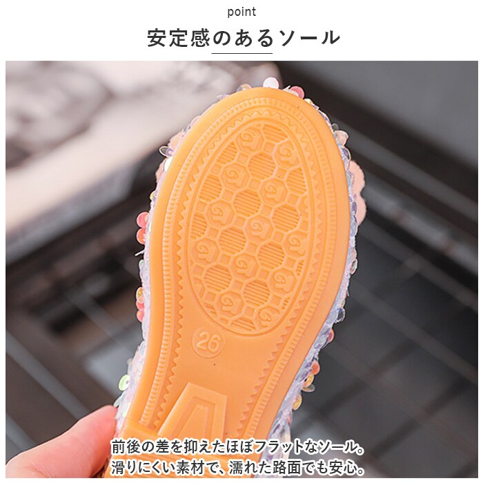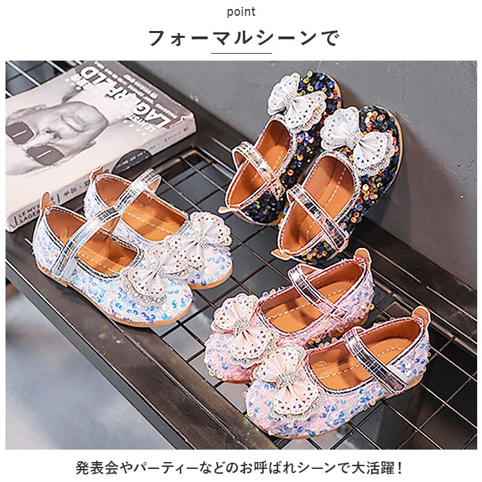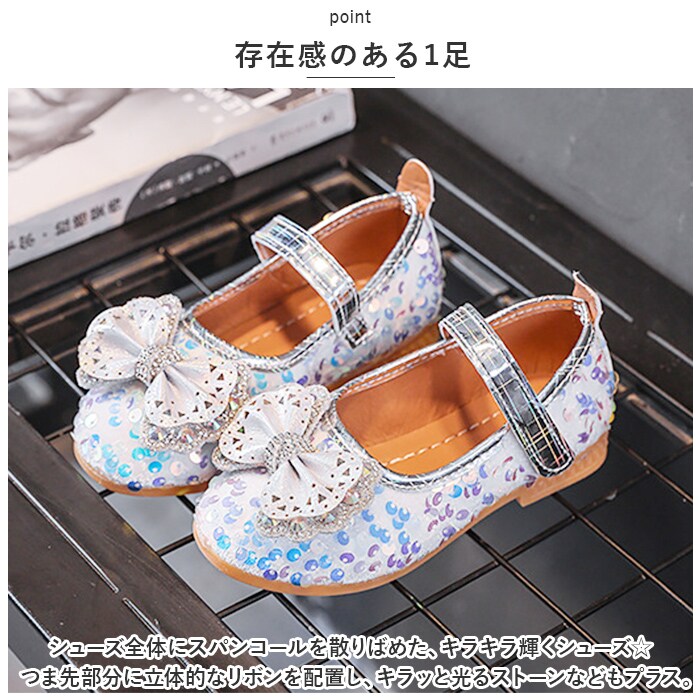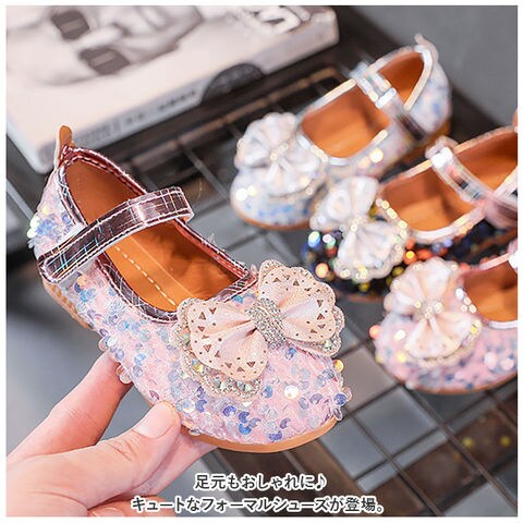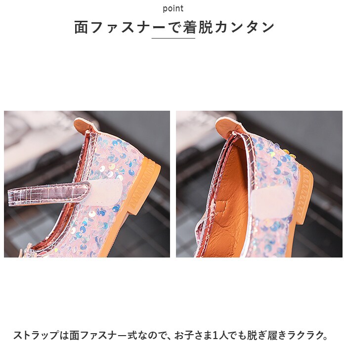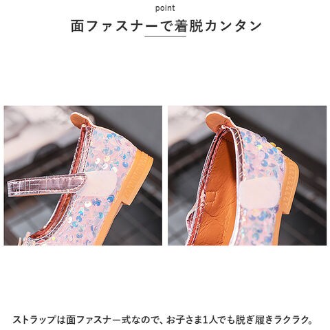 | 商品説明 | 足元もおしゃれに♪キュートなフォーマルシューズが登場。【存在感のある1足】シューズ全体にスパンコールを散りばめた、キラキラ輝くシューズ☆つま先部分に立体的なリボンを配置し、キラッと光るストーンなどもプラス。【面ファスナーで着脱カンタン】ストラップは面ファスナー式なので、お子さま1人でも脱ぎ履きラクラク。【歩きやすさが向上】屈曲性があり、つま先にかけてやや上を向いた形状。つまづきにくく、蹴り上げやすい!【安定感のあるソール】前後の差を抑えたほぼフラットなソール。滑りにくい素材で、濡れた路面でも安心。【フォーマルシーンで】発表会やパーティーなどのお呼ばれシーンで大活躍! |