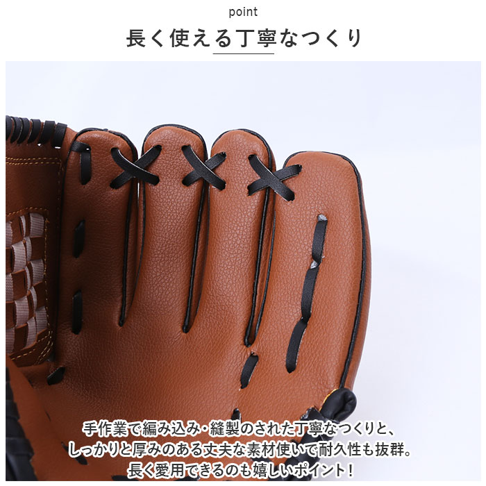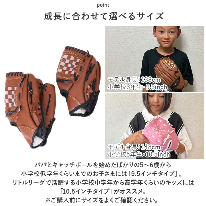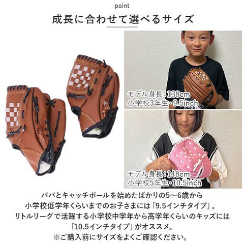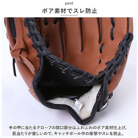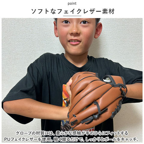 | 商品説明 | 週末のパパとのキャッチボールや、草野球が大好きなキッズにぴったり!使い込むほどに手のひらに馴染む「キッズ用野球グローブ」【ソフトなフェイクレザー素材】グローブの材質には、柔らかな感触が手のひらにフィットするPUフェイクレザーを使用。軽く握るだけで、しっかりとボールをキャッチ。【ボア素材でスレ防止】手の甲に当たるグローブの開口部分はふわふわのボア素材仕上げ。肌当たりが優しいので、キャッチボール中の衝撃やスレを防止。【長く使える丁寧なつくり】手作業で編み込み・縫製のされた丁寧なつくりと、しっかりと厚みのある丈夫な素材使いで耐久性も抜群。長く愛用できるのも嬉しいポイント!【成長に合わせて選べるサイズ】パパとキャッチボールを始めたばかりの5~6歳から小学校低学年くらいまでのお子さまには「9.5インチタイプ」。リトルリーグで活躍する小学校中学年から高学年くらいのキッズには「10.5インチタイプ」がオススメ。(※ご購入前にサイズをよくご確認ください。)【プレゼントにも最適】これから野球を始められるお子さまやお孫さまへのプレゼントに最適!デリケートなキッズの手を優しく守るグローブデビューに最適の逸品。 |