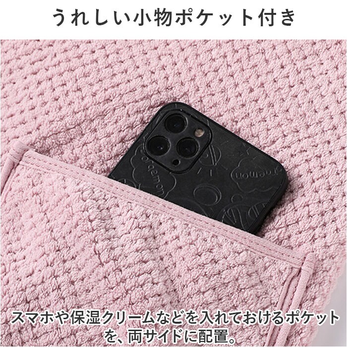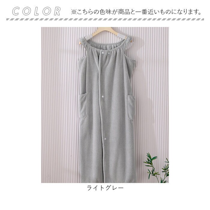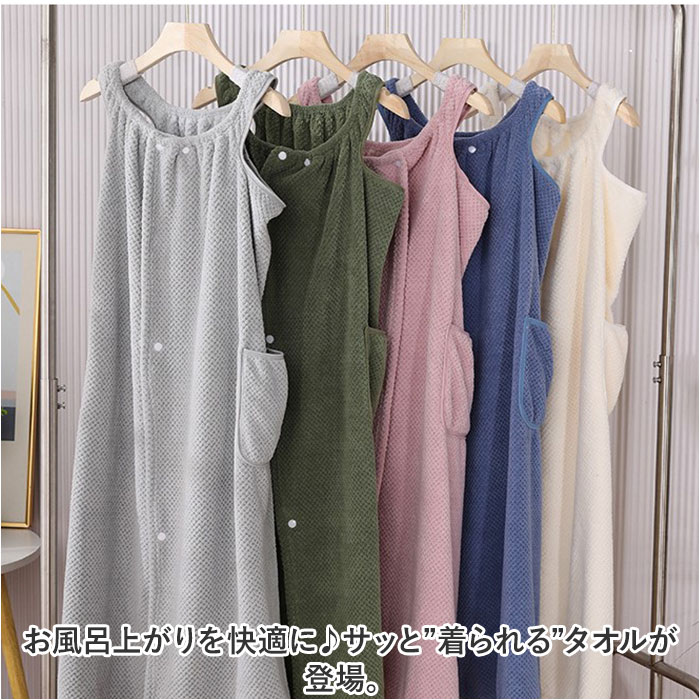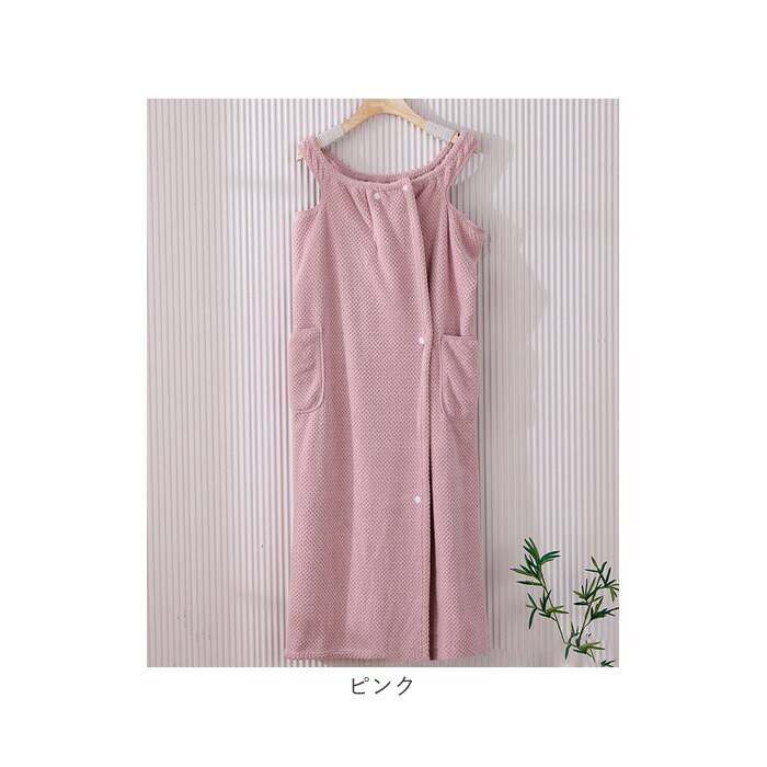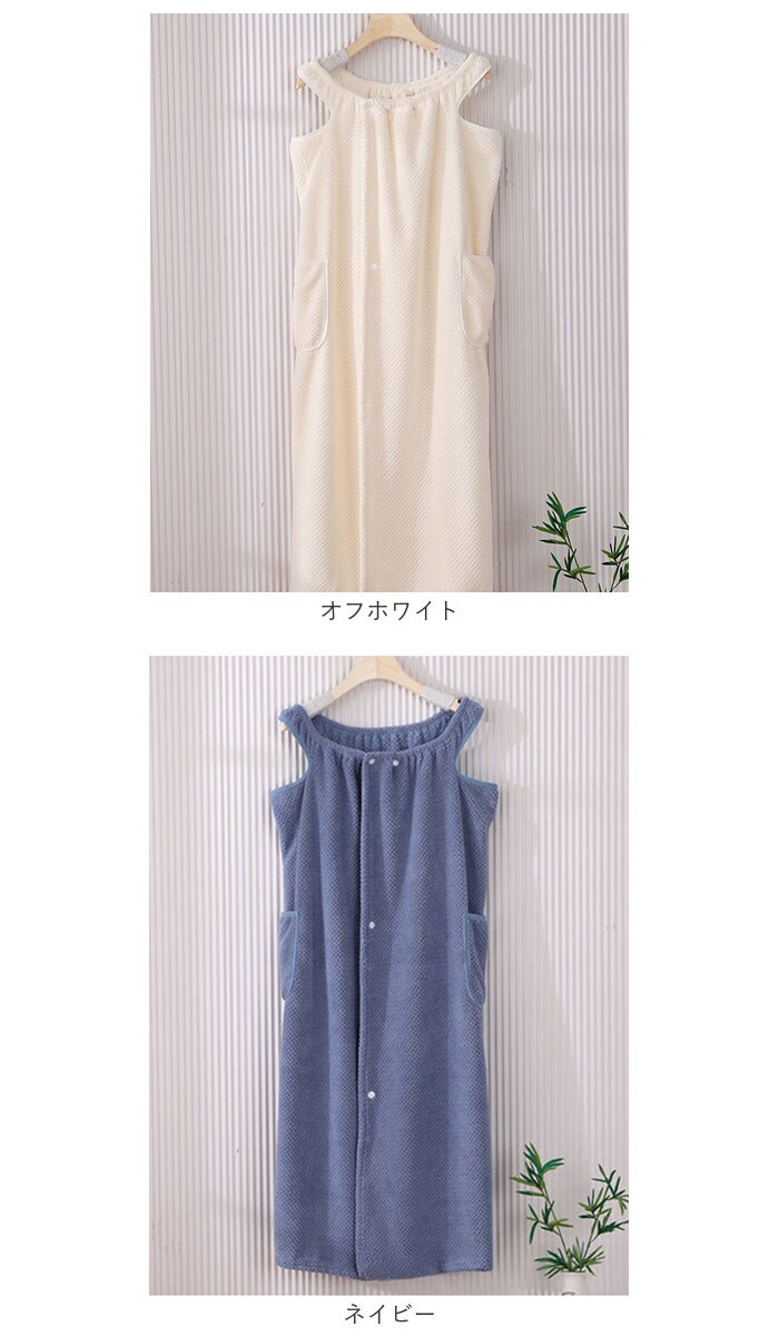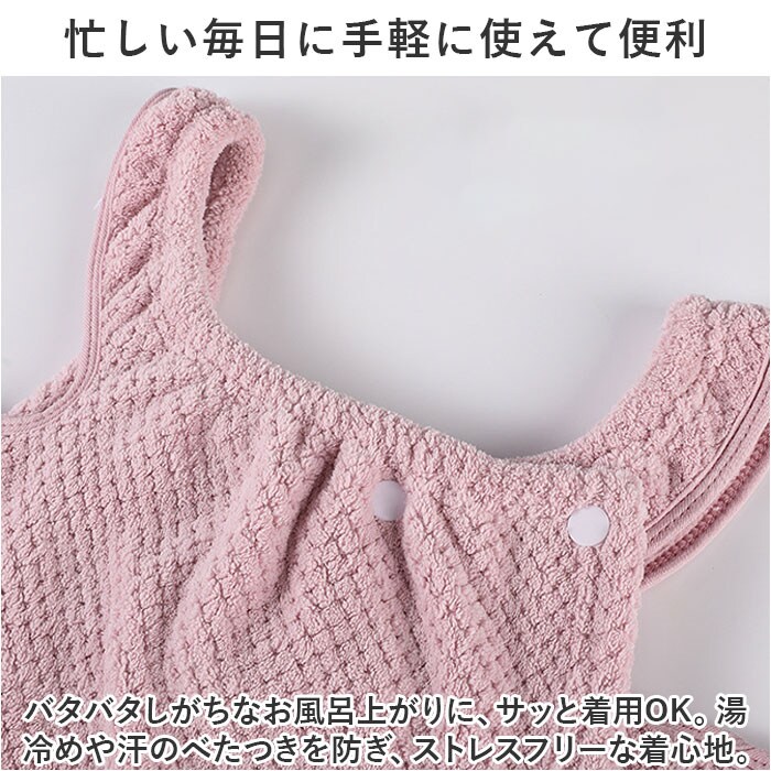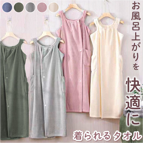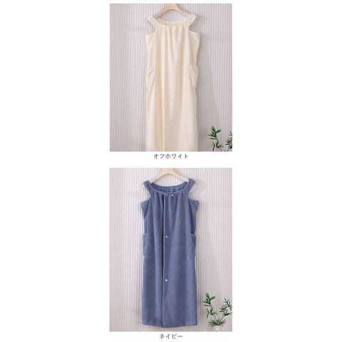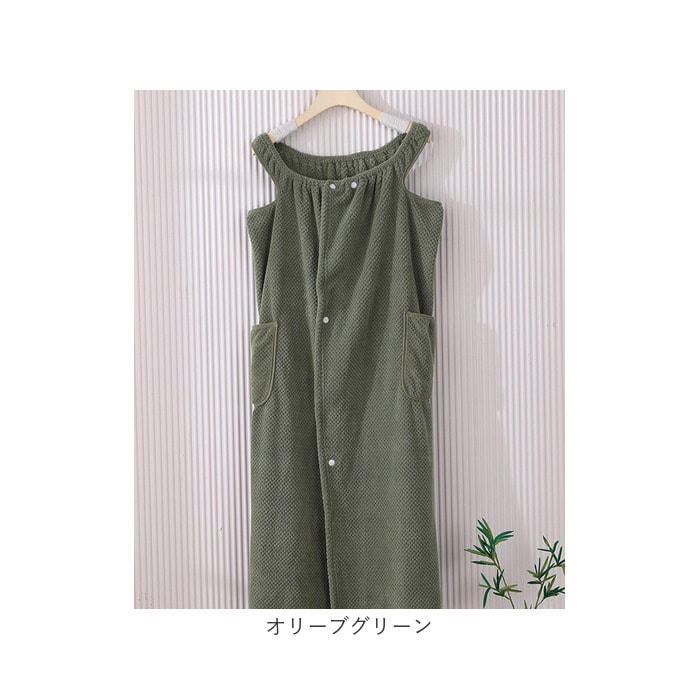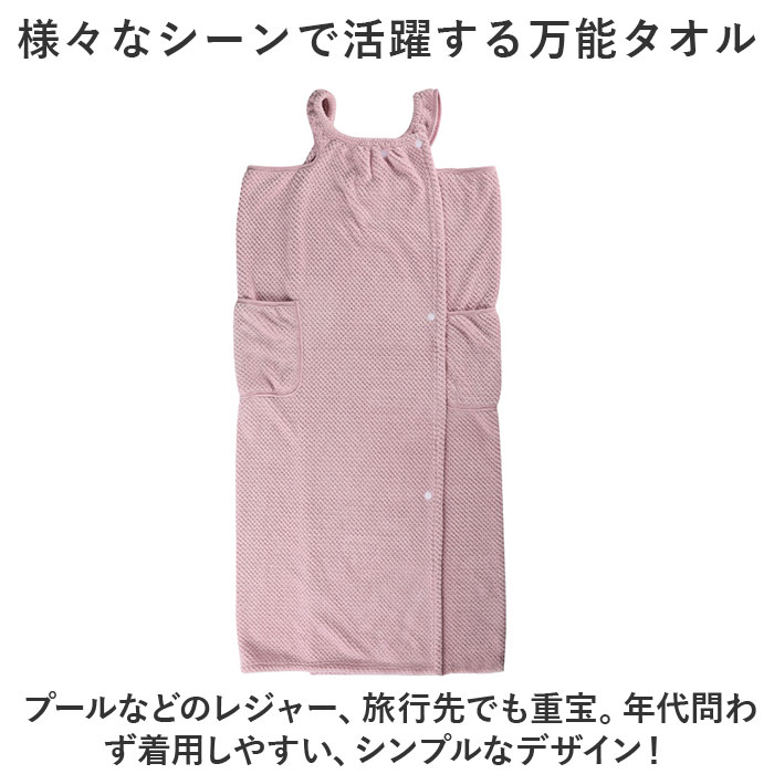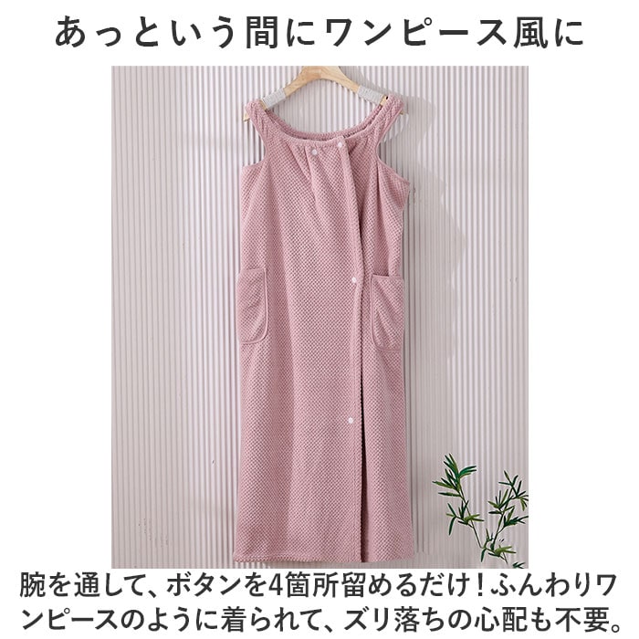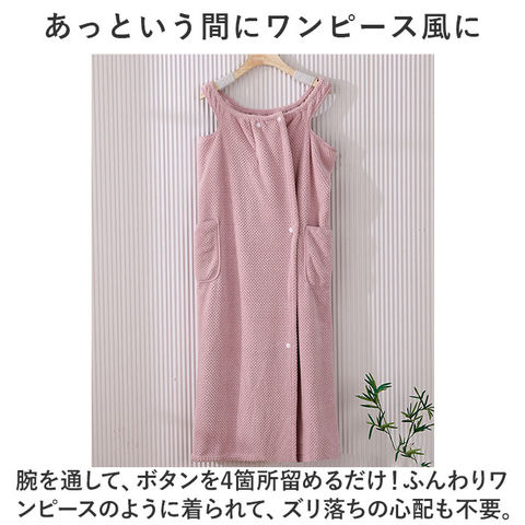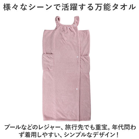 | 商品説明 | お風呂上がりを快適に♪サッと”着られる”タオルが登場。【あっという間にワンピース風に】腕を通して、ボタンを4箇所留めるだけ!ふんわりワンピースのように着られて、ズリ落ちの心配も不要。【忙しい毎日に手軽に使えて便利】バタバタしがちなお風呂上がりに、サッと着用OK。湯冷めや汗のべたつきを防ぎ、ストレスフリーな着心地。【吸水速乾性のあるふんわり素材】柔らかくお肌に優しい素材を使用。水気や汗を素早く吸収し、乾きが早いのも嬉しいポイント。【程よいボリューム感で使いやすい!】薄すぎず厚すぎない生地感で、使い勝手抜群。体を優しく包みこんで、バスタイム後もリラックス♪【うれしい小物ポケット付き】スマホや保湿クリームなどを入れておけるポケットを、両サイドに配置。【様々なシーンで活躍する万能タオル】プールなどのレジャー、旅行先でも重宝。年代問わず着用しやすい、シンプルなデザイン! |